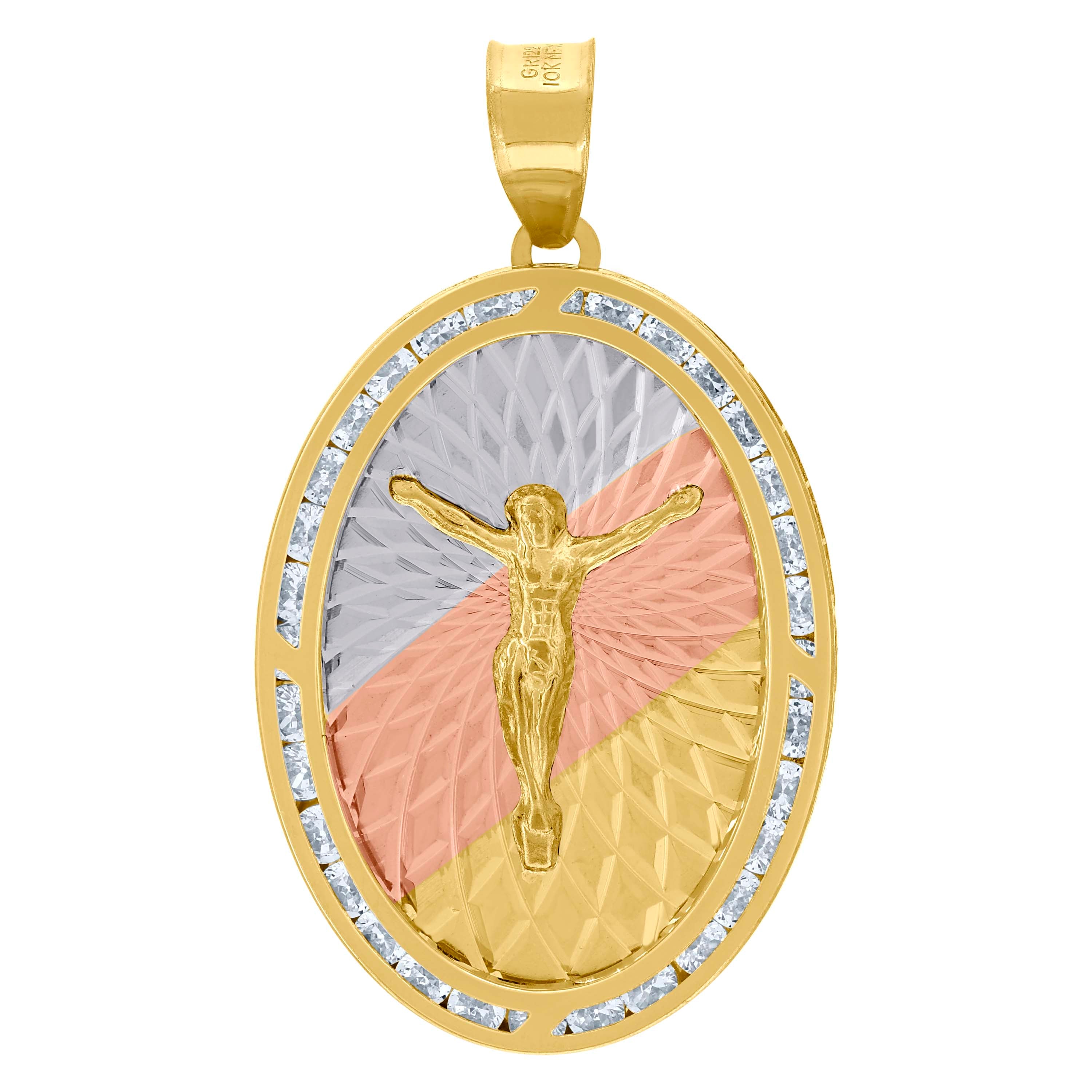 Elevate your style with our 10Kt Gold Tri-Color Pendant—a stunning unisex accessory that beautifully combines elegance and faith. Crafted from pure 10kt tri-color gold, this pendant features a mesmerizing diamond-cut finish that catches the light with every move. The intricate crucifix design is adorned with dazzling white round cubic zirconia set in a secure channel setting, adding a touch of sparkle. With a comfortable single bail closure, this 2.7-gram charm is perfect for any occasion. Measuring 39.6mm in height and 22.4mm in width, it’s a standout piece that complements any look. Ideal for those who appreciate the fusion of traditional and contemporary design, this pendant is a timeless addition to your jewelry collection.