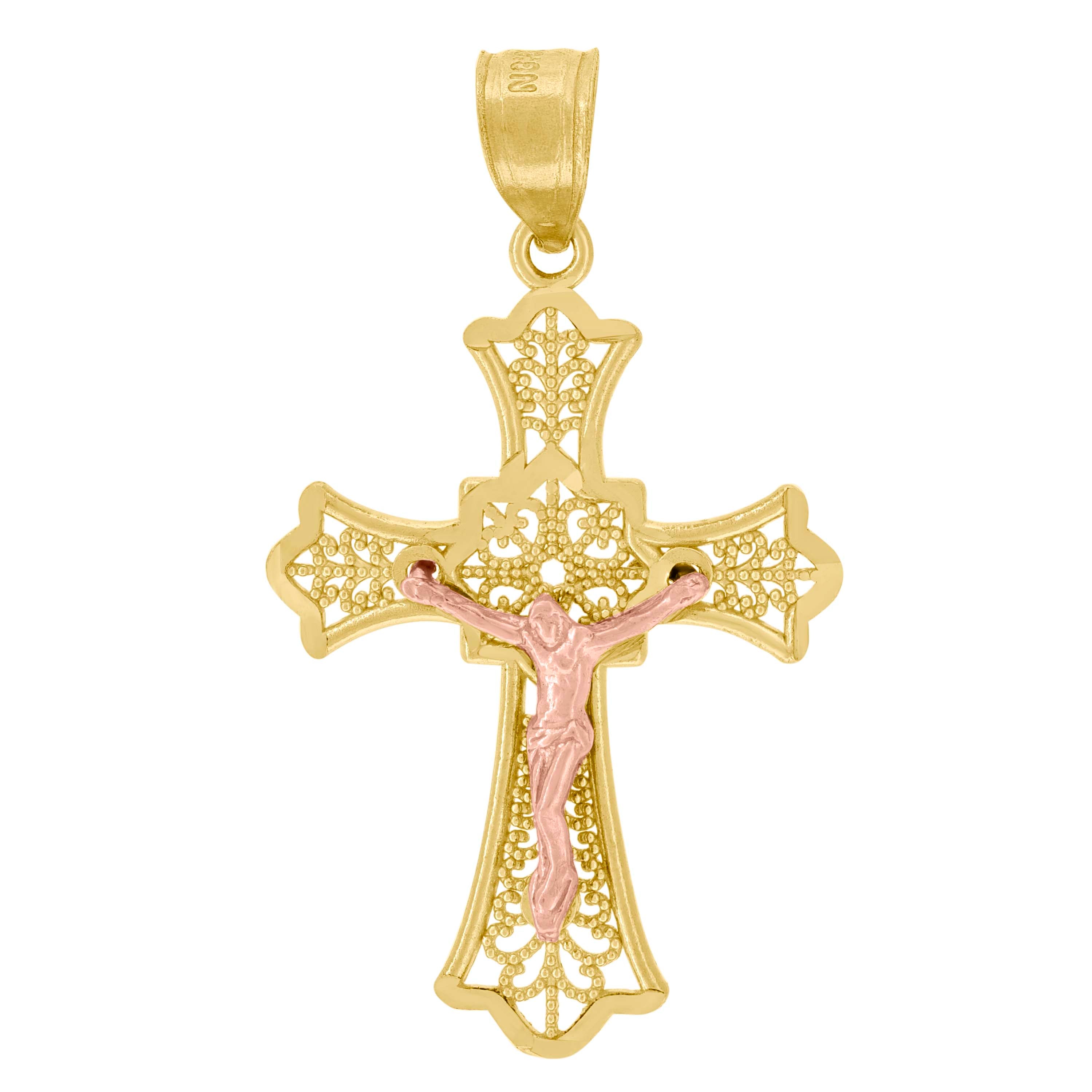 Embrace timeless elegance with our 10Kt Gold Pendant, a masterpiece of craftsmanship and faith. This exquisite unisex cross crucifix charm is crafted from pure 10kt real gold, featuring a stunning two-tone design in yellow and rose gold. Its diamond-cut finish adds a touch of brilliance, enhancing its polished allure. With a lightweight feel at just 1.4 grams, it offers effortless wearability. Measuring 30.7mm in height and 18.2mm in width, this pendant makes a bold yet refined statement. The single bail closure ensures it hangs gracefully from any chain. Celebrate your spirituality with this radiant symbol of devotion, perfect for any occasion.
