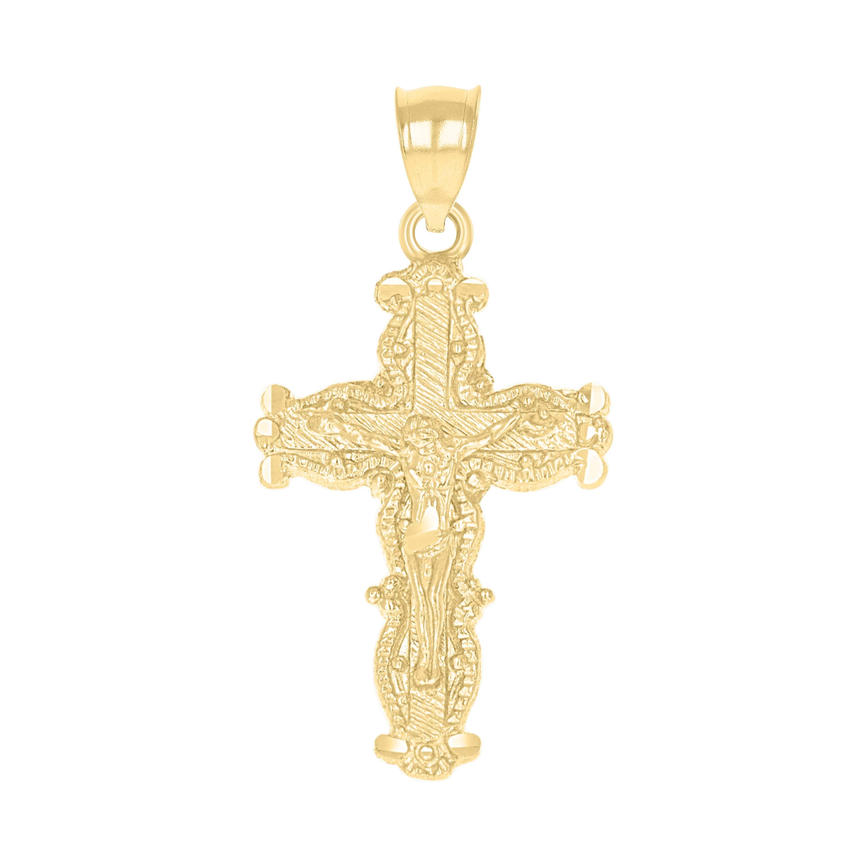 Elevate your style with our 10Kt Real Yellow Gold Diamond-Cut Men's Cross Crucifix Religious Charm Pendant. Crafted from pure 10k gold, this exquisite piece weighs a mere 3 grams, ensuring it is both lightweight and luxurious. The pendant features a textured finish that enhances its radiant yellow hue, making it a perfect symbol of faith and elegance. Designed for men, it boasts a height of 38.2MM and a width of 18.9MM, providing a bold yet refined statement. The single bail closure ensures secure attachment to your favorite chain. Ideal for every occasion, this pendant is a timeless addition to any jewelry collection, embodying both tradition and style.