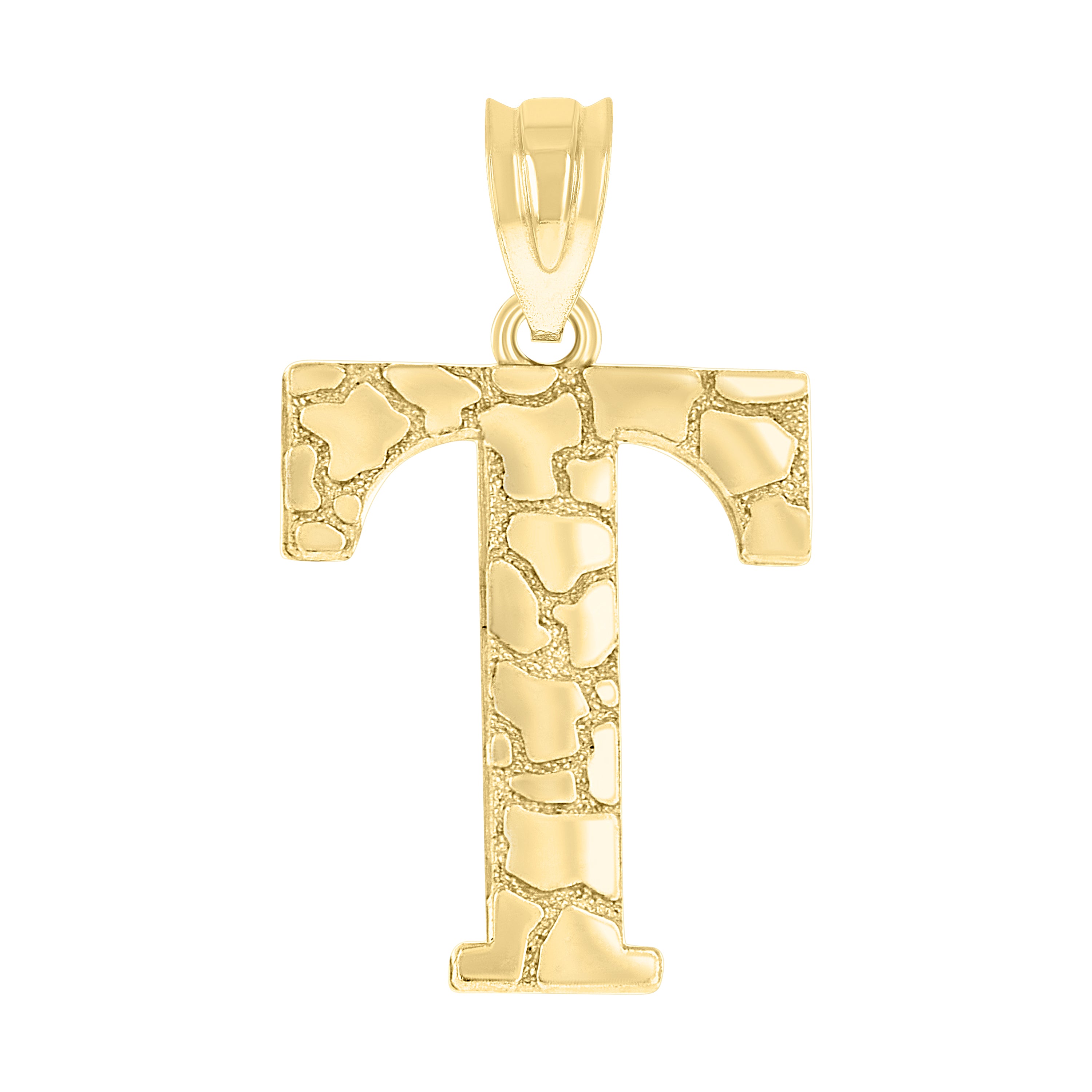 Introducing the exquisite 10kt Yellow Gold Unisex Nugget Initial T Charm Pendant, a perfect blend of elegance and style. Weighing 0.9 grams, this stunning piece is crafted with a unique nugget finish, offering a distinctive texture that captures light beautifully. The pendant measures 21.9MM in height and 11.8MM in width, making it a bold yet refined statement piece. Designed with a single bail closure, it's easy to attach to your favorite chain. Embrace timeless charm with this initial T pendant, ideal for personalizing your collection or gifting to someone special.
