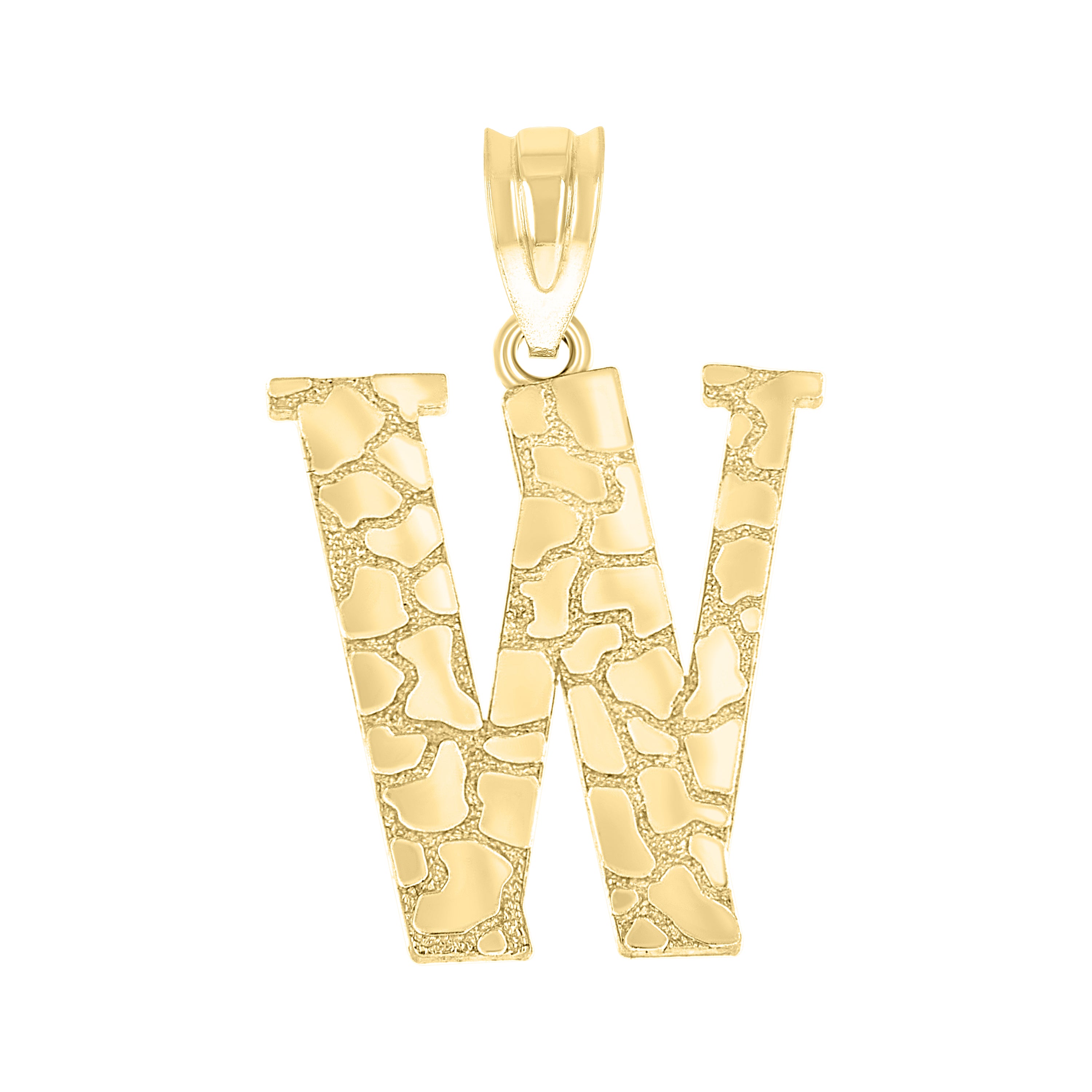 Discover the timeless elegance of our 10kt Yellow Gold Unisex Nugget Initial "W" Charm Pendant. Crafted with a unique nugget finish, this exquisite piece weighs just 1.3 grams, offering a lightweight yet luxurious feel. The single bail closure ensures a secure fit, while the pendant's dimensions of 22.2MM in height and 12.5MM in width provide a perfect balance of subtlety and style. Ideal for any occasion, this charming piece is the perfect addition to any jewelry collection.