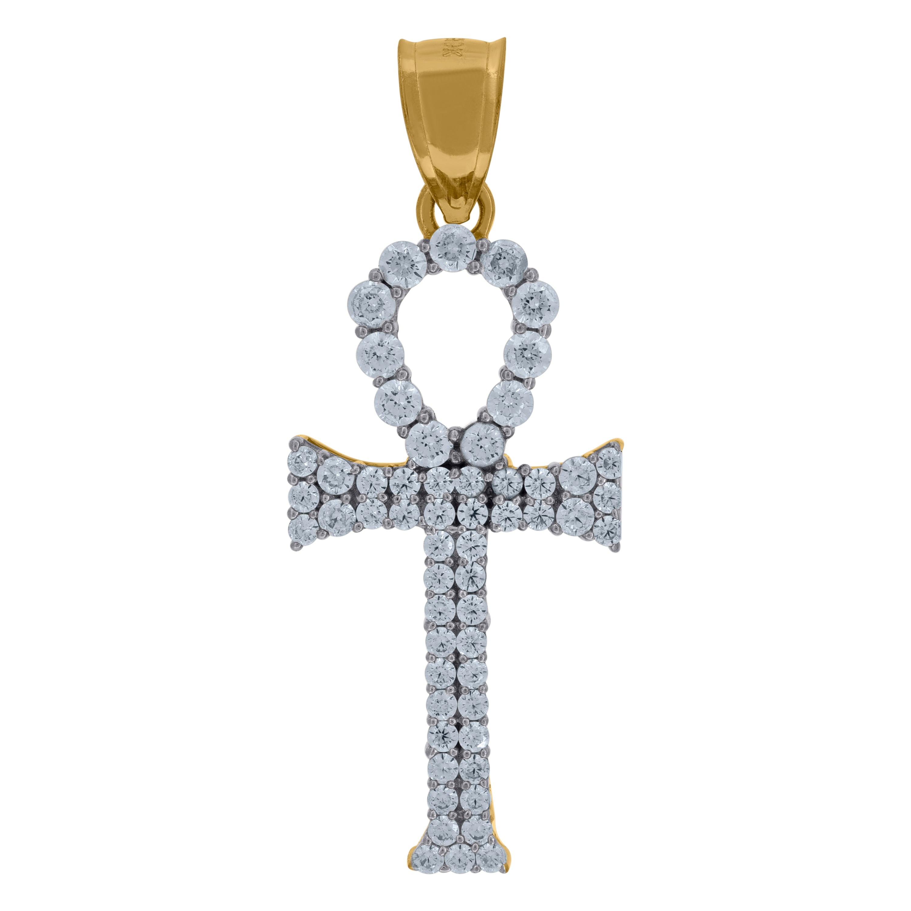 Celebrate your faith and style with this exquisite 10kt Two-Tone Gold Ankh Charm Pendant. Weighing 2.3 grams, this polished piece features a single bail closure for secure wear. The pendant measures a striking 35.7MM in height and 14.2MM in width, making it a standout accessory. Adorned with a shimmering white round cubic zirconia set in prong style, this charm adds a touch of elegance and sparkle, perfect for any religious or fashion occasion.