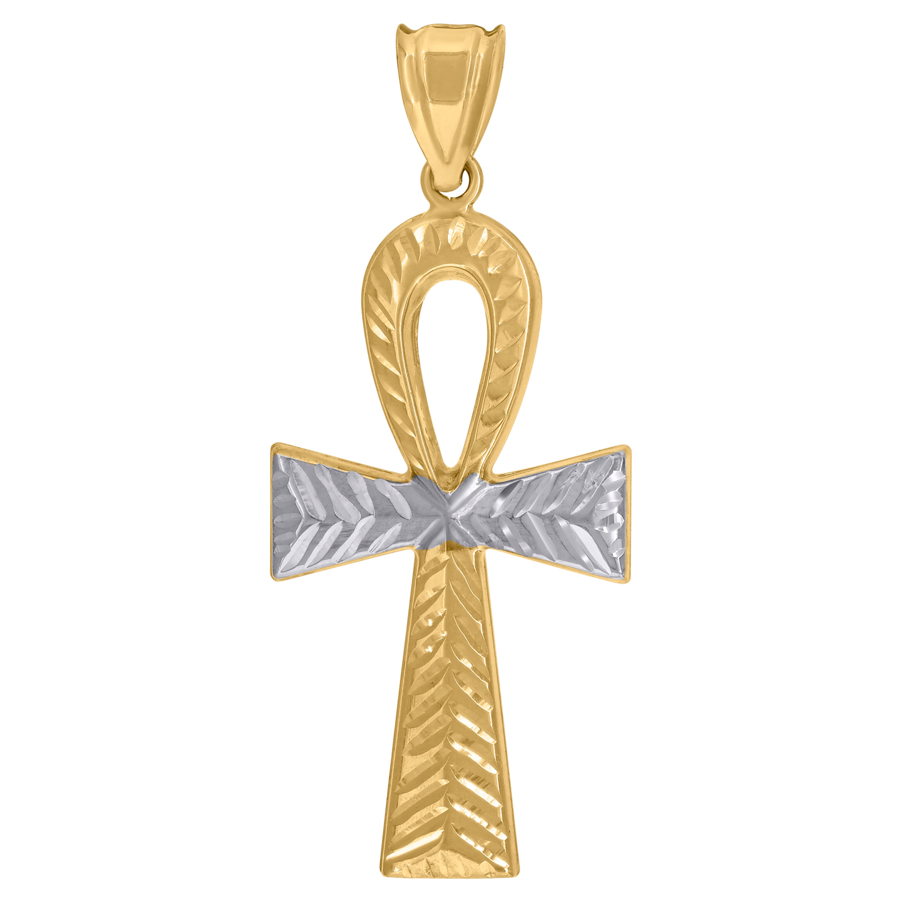 Elevate your spirituality with this exquisite 10kt Two-Tone Gold Men's Religious Ankh Cross Pendant. Weighing a refined 2.5 grams, its design is expertly diamond-cut, offering a brilliant shine that captures the eye. The pendant stands at an impressive 50.8MM in height and 21.2MM in width, ensuring a bold statement piece that remains timeless. Secured with a single bail closure, this piece is crafted without cubic zirconia, allowing the striking craftsmanship to take center stage. Perfect for daily wear or special occasions, this pendant symbolizes eternal life and divine protection.