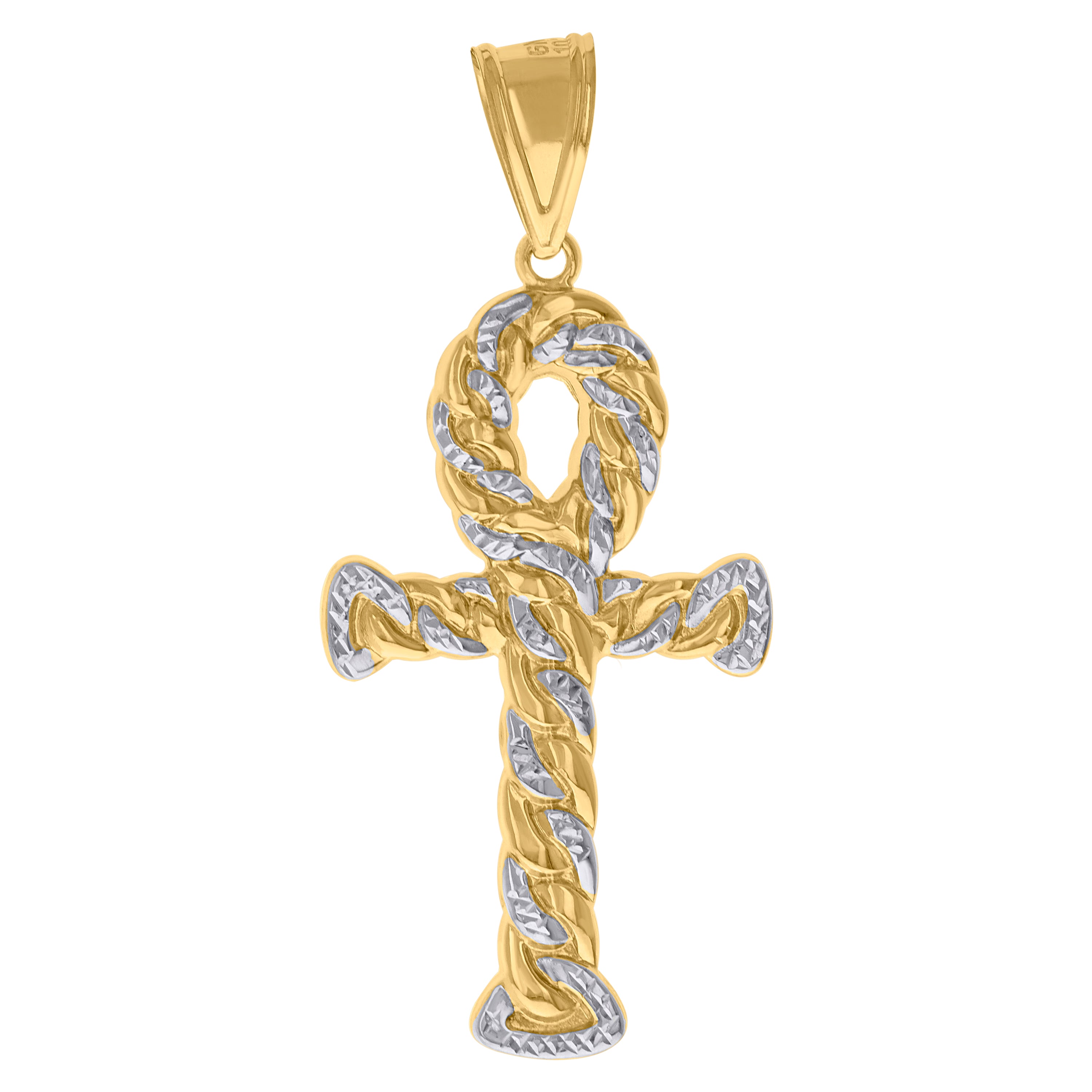 Elevate your style with this exquisite 10kt Two-Tone Gold Men's Twisted Ankh Cross Pendant. Masterfully crafted with a diamond-cut finish, this religious charm combines elegance and symbolism. Measuring 51.1mm in height and 23mm in width, it features a sleek single bail closure. Weighing 2.3 grams, this pendant is a perfect blend of sophistication and spirituality, ideal for making a bold statement without the addition of CZ.
