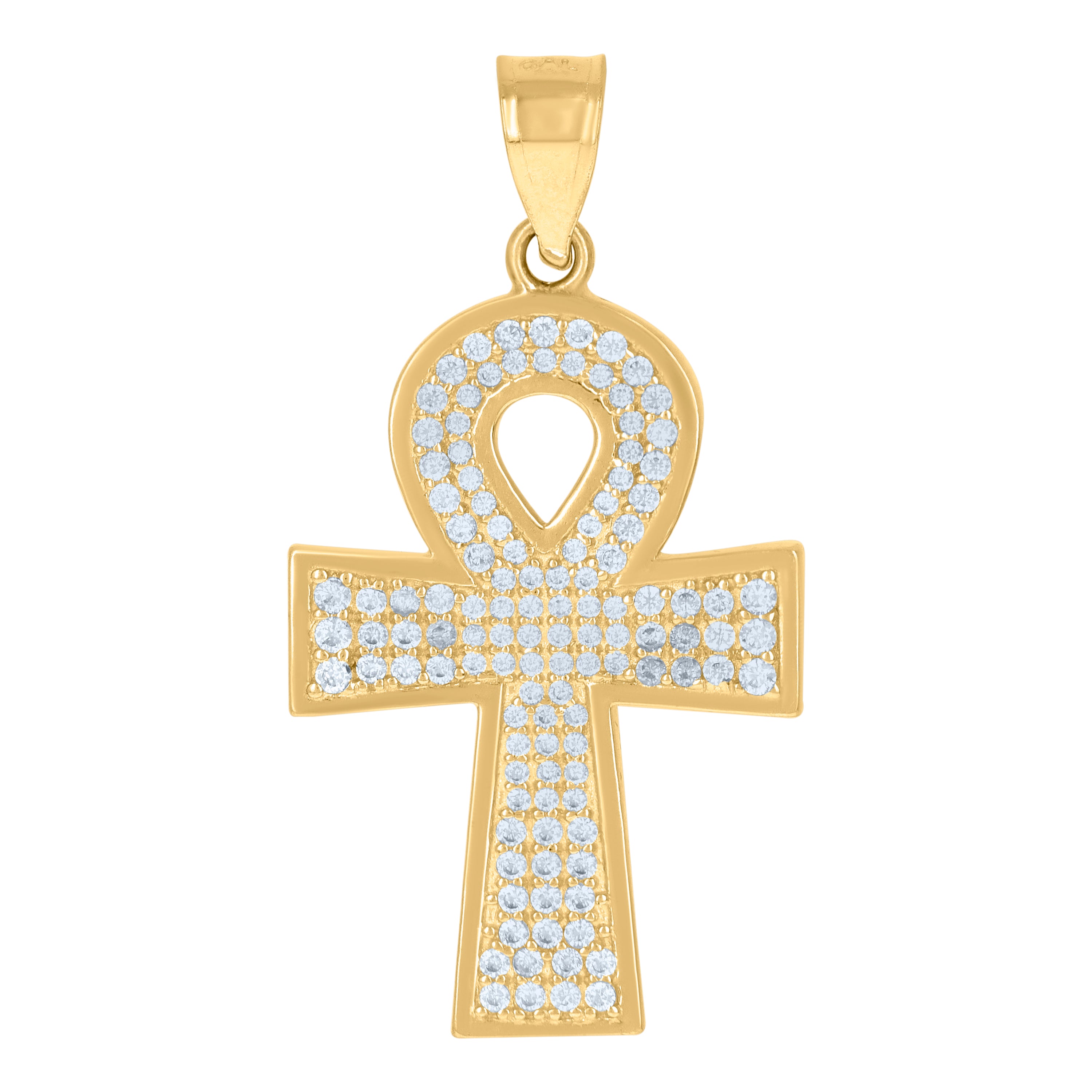 Elevate your style with this 10kt Yellow Gold Men's Ankh Cross Pendant, a symbol of eternal life and strength. This polished Egyptian charm, weighing 2.3 grams, showcases a 33mm height and 17mm width, adorned with dazzling white round cubic-zirconia stones set in a secure prong setting. The single bail closure ensures a seamless finish, making it a perfect blend of spiritual elegance and modern craftsmanship.