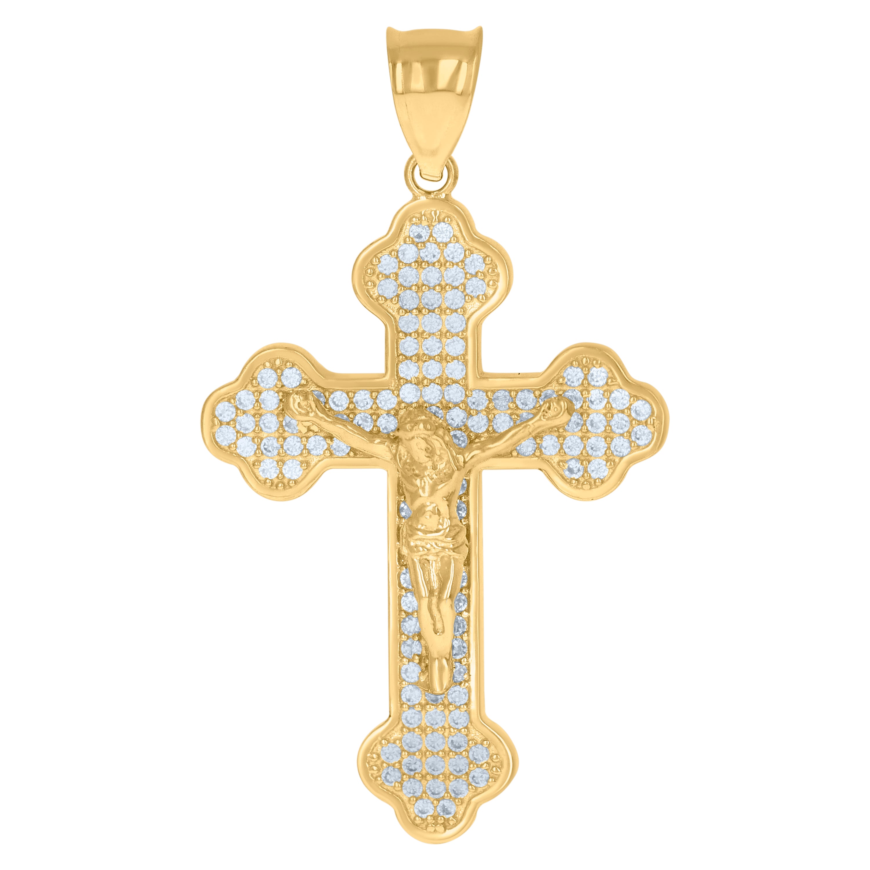 Embrace your faith with this exquisite 10kt Yellow Gold Men's Cubic-Zirconia Religious Budded Cross Crucifix Charm Pendant. Weighing a refined 3.9 grams, this pendant boasts a polished finish that gleams with every movement. Its elegant design is accentuated by a single bail closure, ensuring secure wear. Measuring 44.6MM in height and 25.1MM in width, it features prong-set, round, white cubic-zirconia that adds a touch of brilliance to your spiritual look. Perfect for both daily wear and special occasions, this pendant is a timeless symbol of devotion and style.