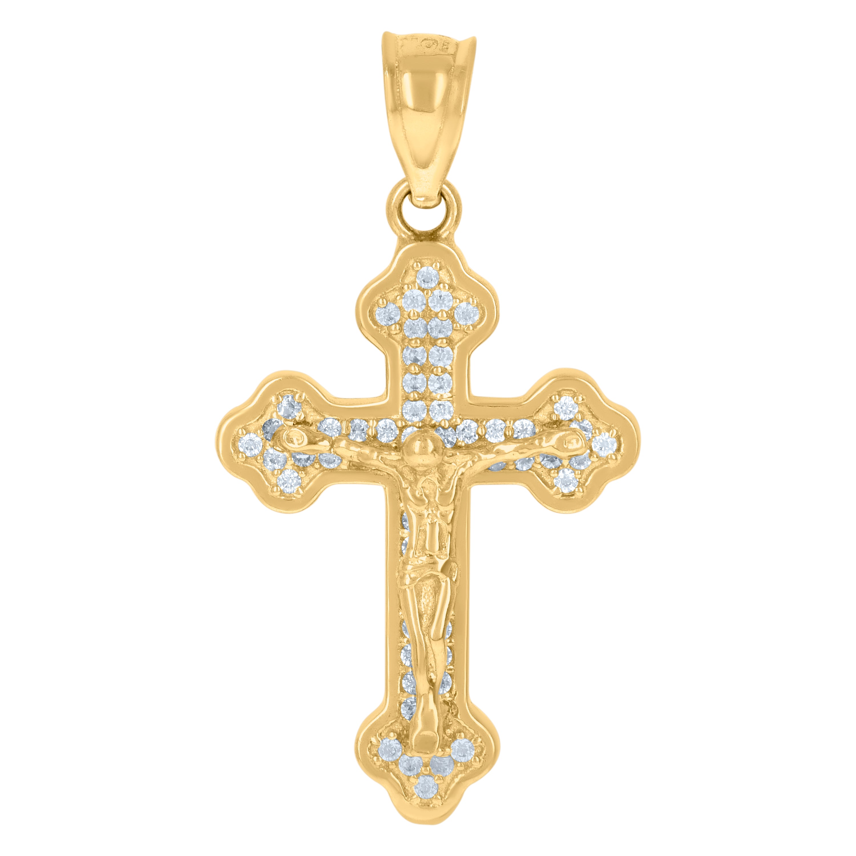 Embrace your faith with elegance through our exquisite 10kt Yellow Gold Men's Religious Budded Cross Crucifix Charm Pendant. Weighing a delicate 1.5 grams, this polished treasure captivates with its divine shine. Featuring a single bail closure for secure wear, it measures 27.3MM in height and 14.3MM in width, perfectly proportioned for a statement of devotion. The prong-set, round white cubic zirconia adds a sparkling touch, elevating the cross's allure. A timeless piece that blends spirituality with sophistication.