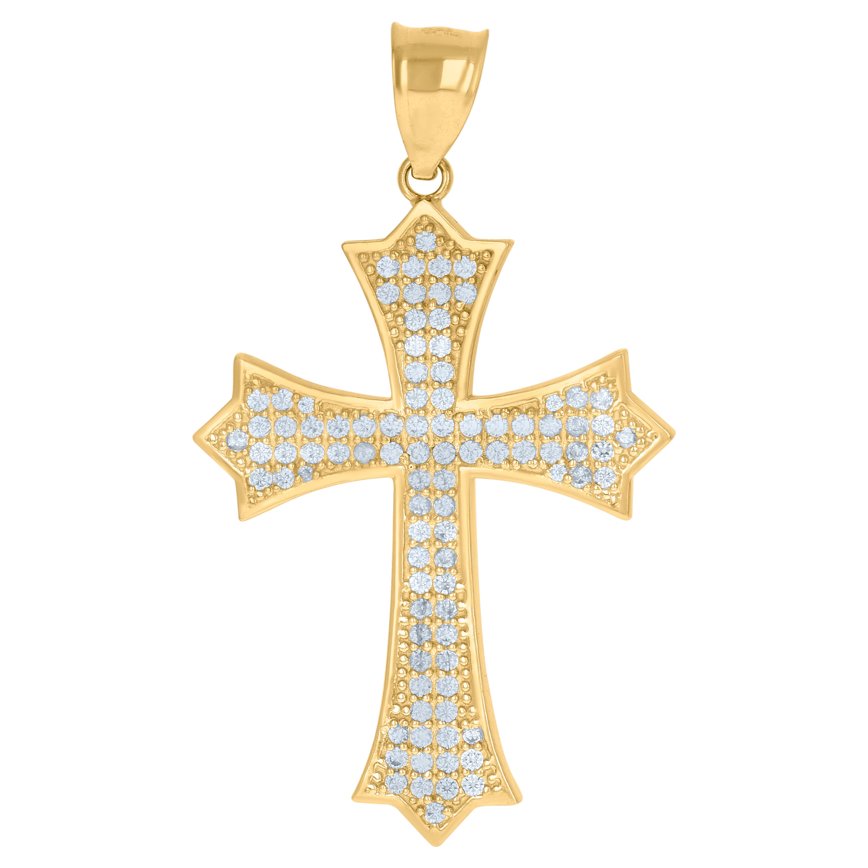 Embrace elegance and faith with this 10kt Yellow Gold Men's Religious Fleur De Lis Cross Charm Pendant. Weighing 3.1 grams, it boasts a polished finish that shines with sophistication. The pendant measures 43.5MM in height and 25.7MM in width, creating a bold statement. Adorned with round, white cubic-zirconia set in prong settings, it adds just the right touch of sparkle. Securely attached with a single bail, this piece is perfect for any occasion, combining timeless design with modern flair.