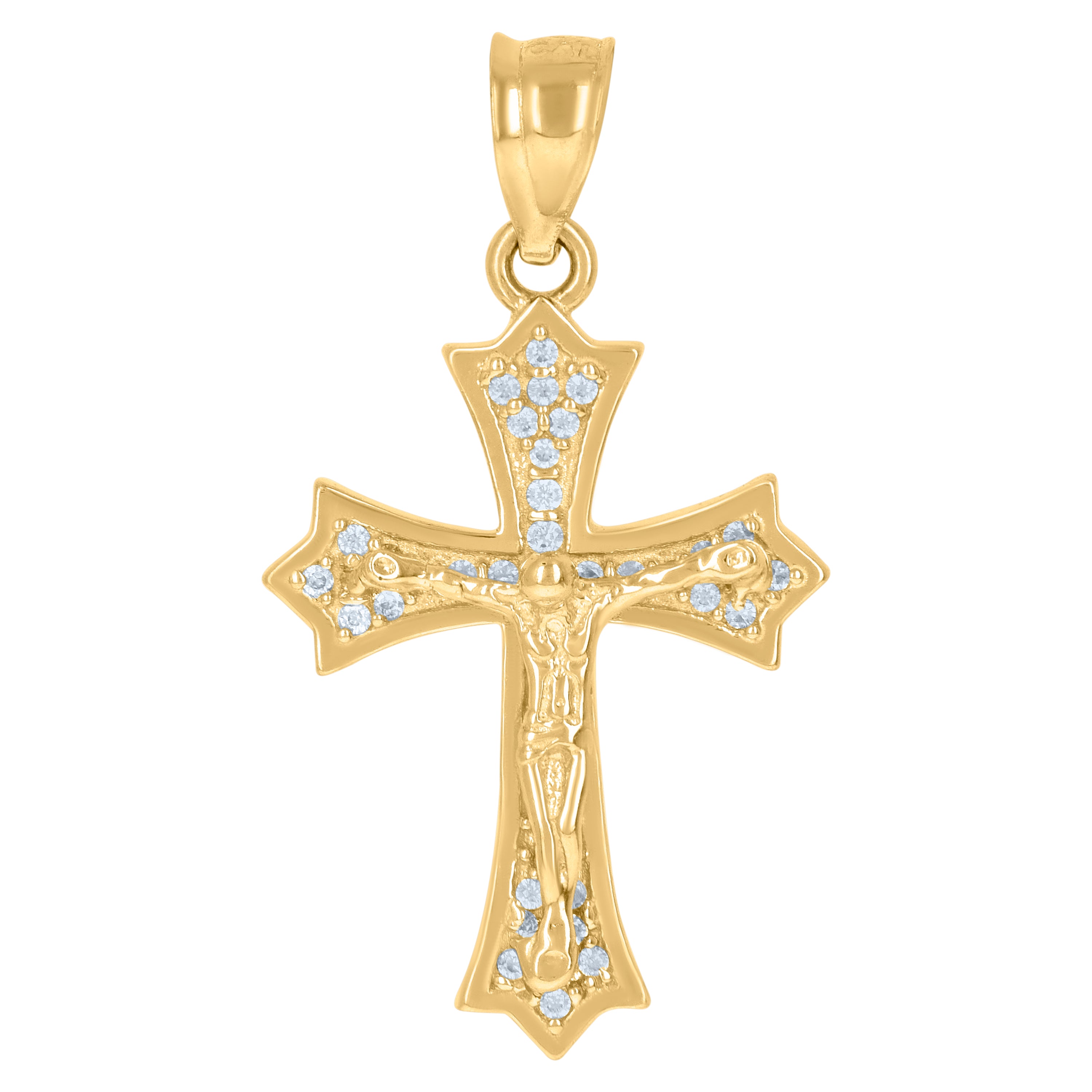 Elevate your style with this exquisite 10kt Yellow Gold Men's Fleur De Lis Crucifix Cross Pendant. Weighing 1.3 grams, this piece features a polished finish that gleams with elegance. Adorned with sparkling white round cubic zirconia in a prong setting, it captures light beautifully. Measuring 26.7mm in height and 14.5mm in width, this charm exudes sophistication and religious symbolism. The single bail closure ensures a secure fit on your favorite chain. A timeless addition to any jewelry collection.