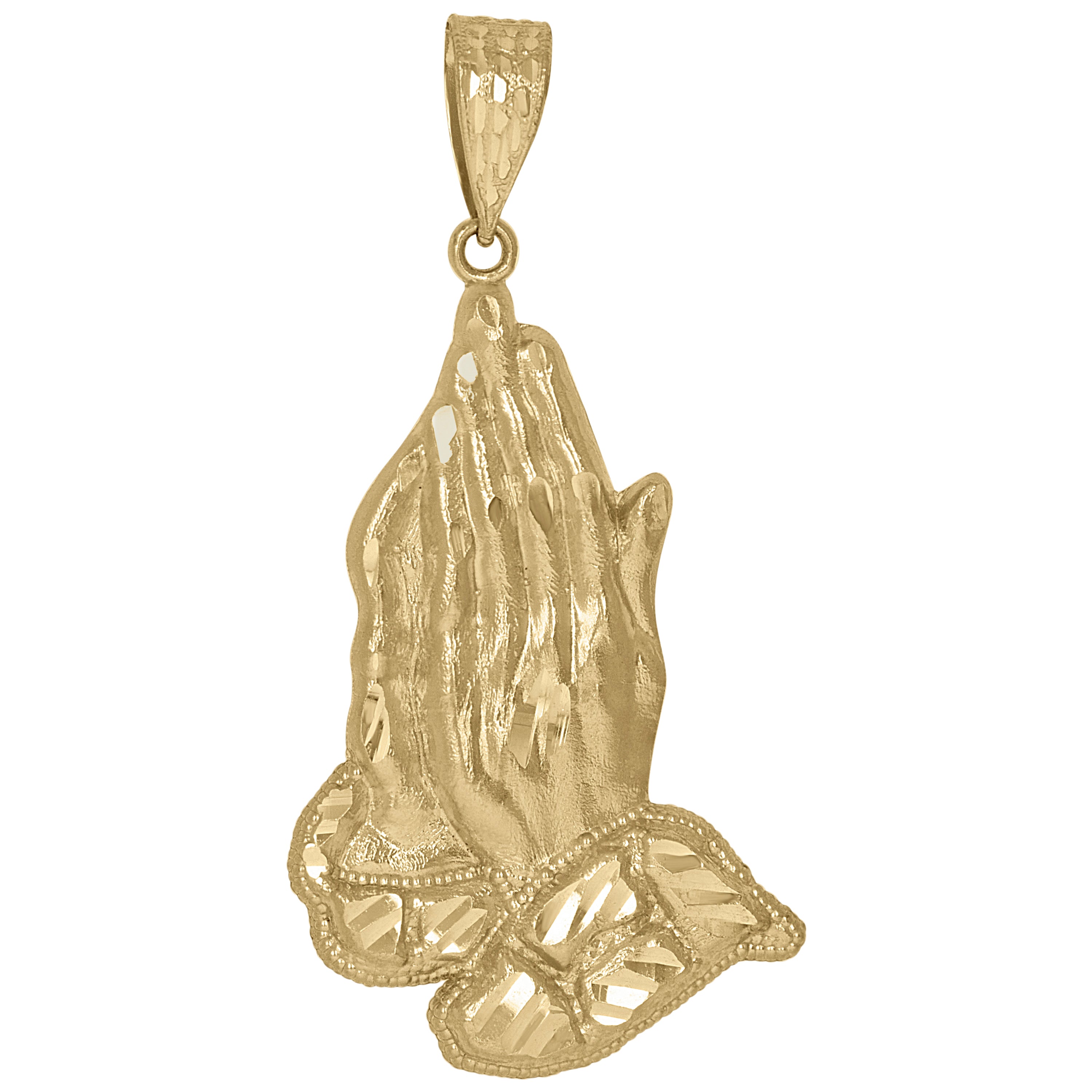 Elevate your style with this exquisite 10kt Real Yellow Gold Pendant, a testament to craftsmanship and faith. Designed for the discerning gentleman, this Diamond-Cut Nugget Pendant features intricately detailed praying hands, symbolizing hope and devotion. Weighing 8.2 grams, its substantial feel is balanced by a refined appearance, perfect for any occasion. The pure 10k gold shines brilliantly with its rich yellow hue, enhanced by a unique nugget finish that adds texture and depth. Measuring a striking 65.4MM in height and 32.6MM in width, this pendant makes a bold statement without overwhelming. The single bail closure ensures a secure and comfortable fit. Whether worn daily or saved for special events, this pendant is a meaningful and stylish addition to any jewelry collection.