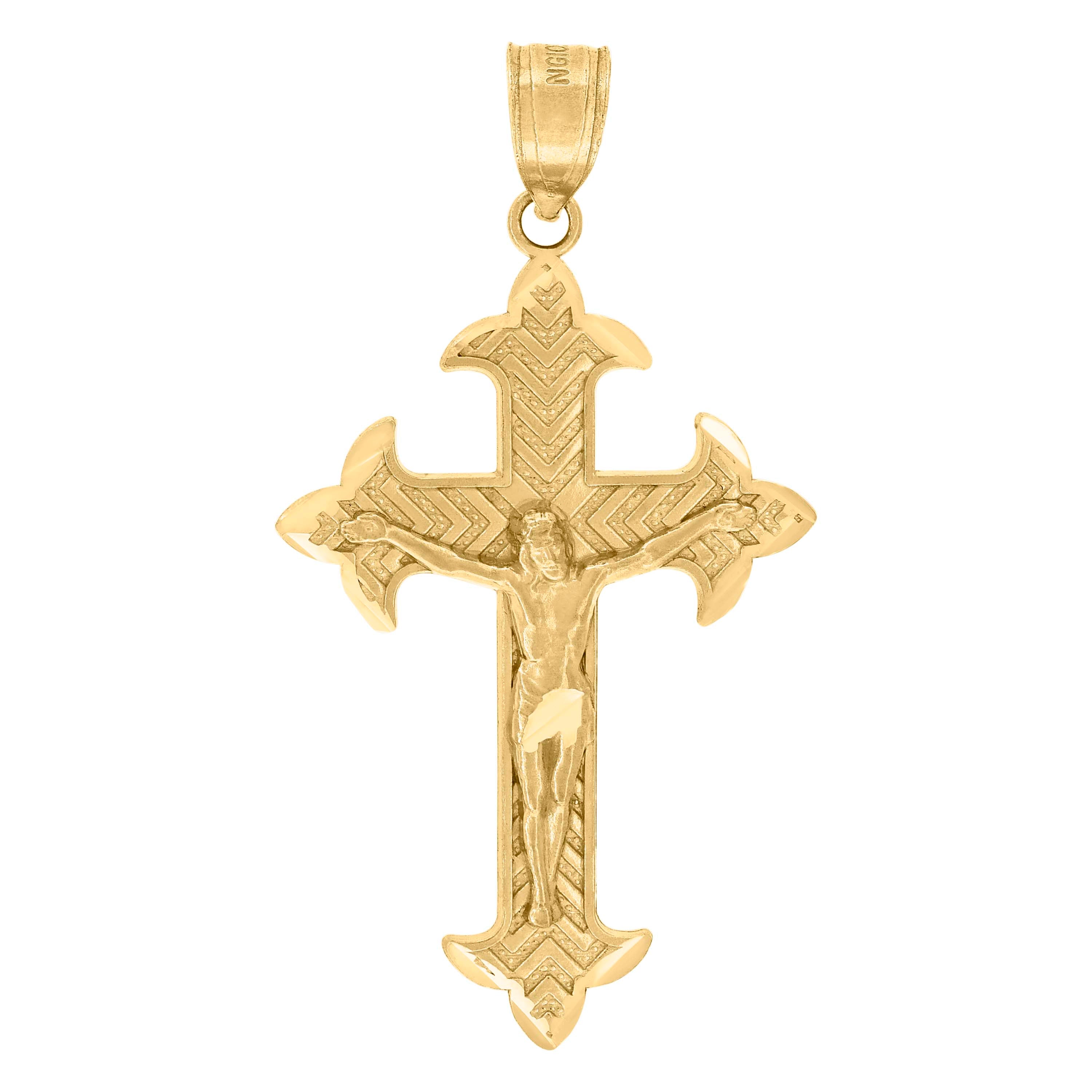 Elevate your style with this exquisite 10Kt Gold Pendant, a timeless symbol of faith and elegance. Crafted from pure 10k real yellow gold, this unisex cross crucifix charm features a stunning diamond-cut texture that catches the light beautifully. Weighing just 1.2 grams, it's lightweight yet durable, perfect for daily wear. The pendant's dimensions are a graceful 37.6MM in height and 19.9MM in width, making it a striking yet subtle addition to any outfit. The single bail closure ensures easy attachment to your favorite chain. Ideal for both men and women, this religious charm is a meaningful gift for any occasion. Embrace its classic beauty and make it a cherished part of your jewelry collection today.