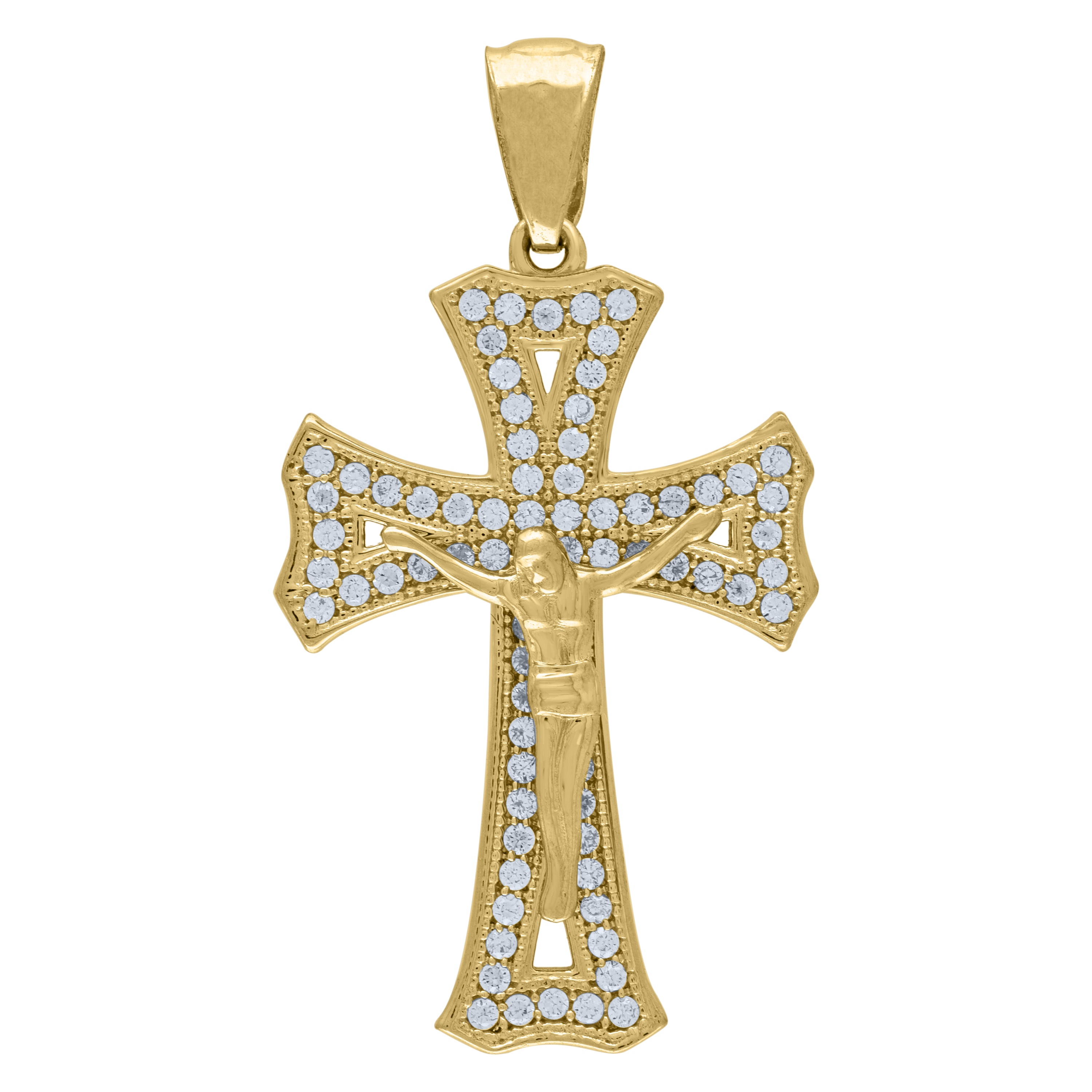 Elevate your style with this exquisite 10Kt Gold Pendant, designed for the discerning man who appreciates elegance and faith. Crafted in genuine 10kt yellow gold, this pendant features a stunning Cubic-Zirconia Crucifix Cross, combining religious symbolism with modern luxury. Weighing a comfortable 3.3 grams, this polished masterpiece ensures lasting shine and sophistication. The single bail closure offers easy wearability, while the prong-set round white cubic-zirconia stones add a dazzling finish. Perfect for any occasion, this pendant is a timeless accessory that speaks to both faith and fashion. Make a statement of grace and confidence with this captivating piece.