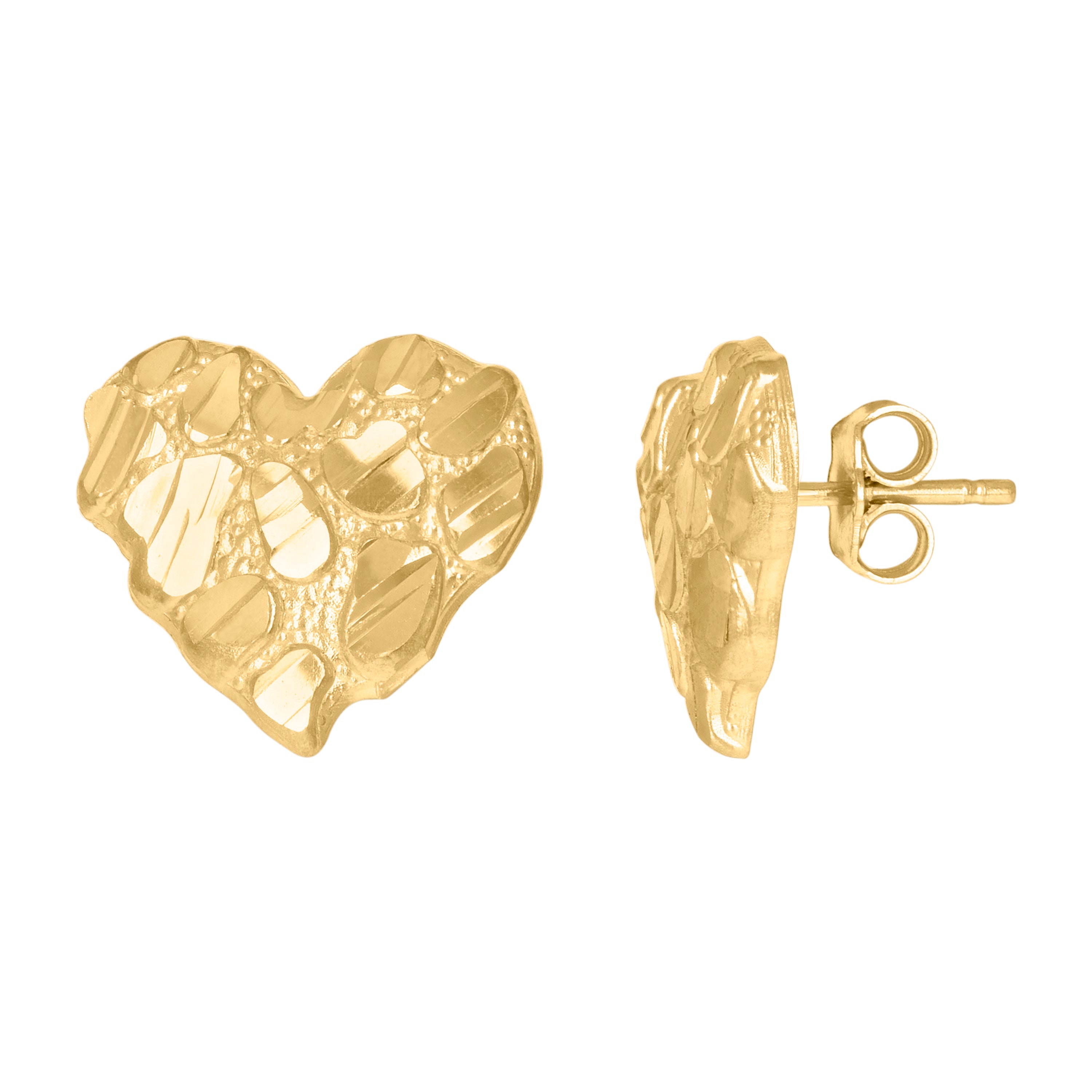 Indulge in the timeless elegance of these 10kt Yellow Gold Women's Nugget Heart Stud Earrings. Expertly crafted with a diamond-cut finish, these earrings shimmer with a luxurious glow that captures the light beautifully. Weighing 1.8 grams, they are lightweight yet substantial enough to make a statement. Each earring measures 12.1 mm in height and 12.8 mm in width, offering a perfect balance of boldness and sophistication. The nugget heart design exudes a unique charm, while the push-back closure ensures a secure and comfortable fit for everyday wear. Ideal for adding a touch of glamour to any outfit, these stud earrings are a must-have accessory for any jewelry collection.