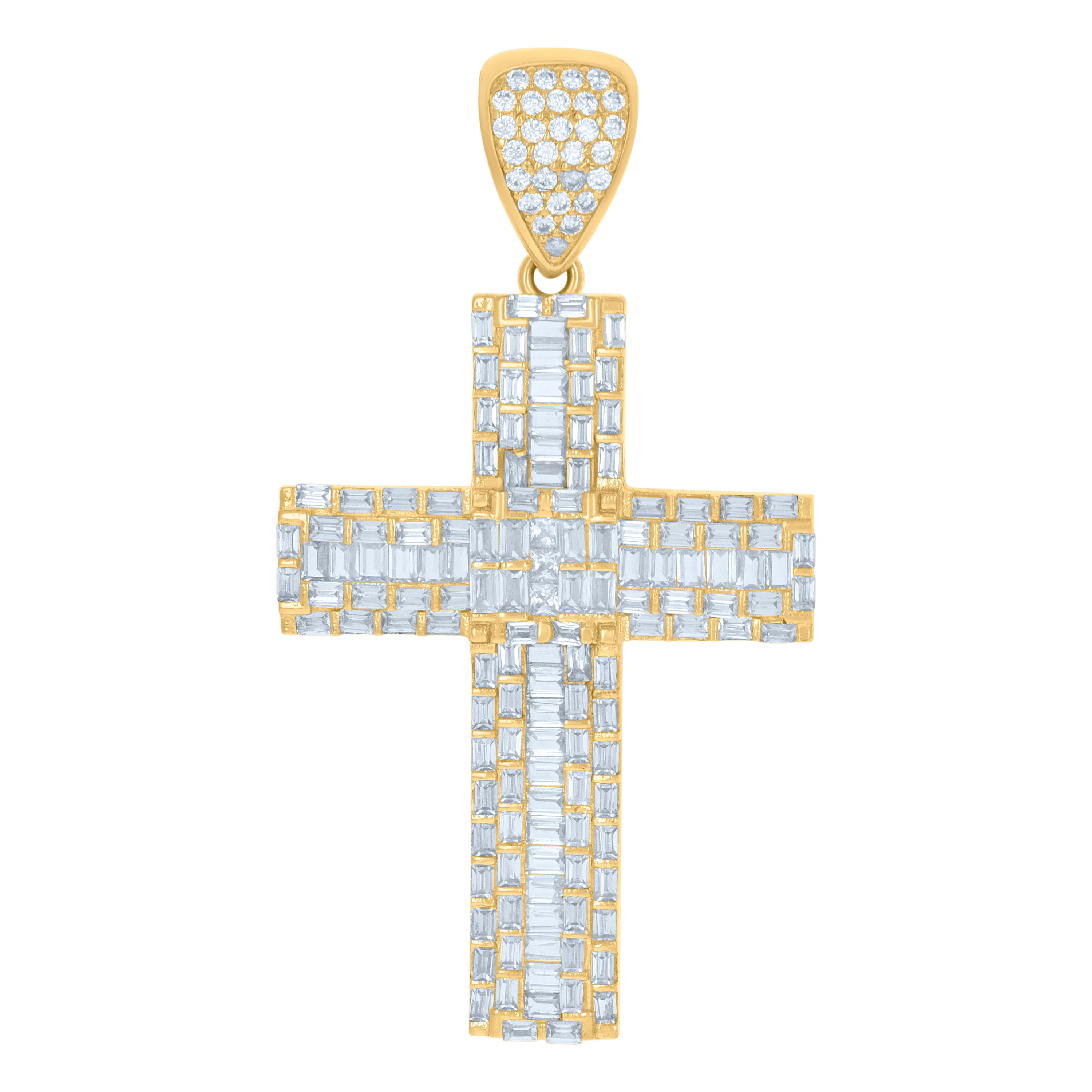 Elevate your style with this exquisite 10kt Yellow Gold Men's Cross Pendant. Showcasing a harmonious blend of round and baguette-cut cubic zirconia stones, this religious charm dazzles with its polished finish. Weighing 5.2 grams, the pendant measures 42.4MM in height and 22.7MM in width, offering a substantial yet refined look. The prong-set white cubic zirconia stones capture light effortlessly, adding a touch of brilliance to your ensemble. The single bail closure ensures secure and easy wear, making it a perfect addition to any jewelry collection.