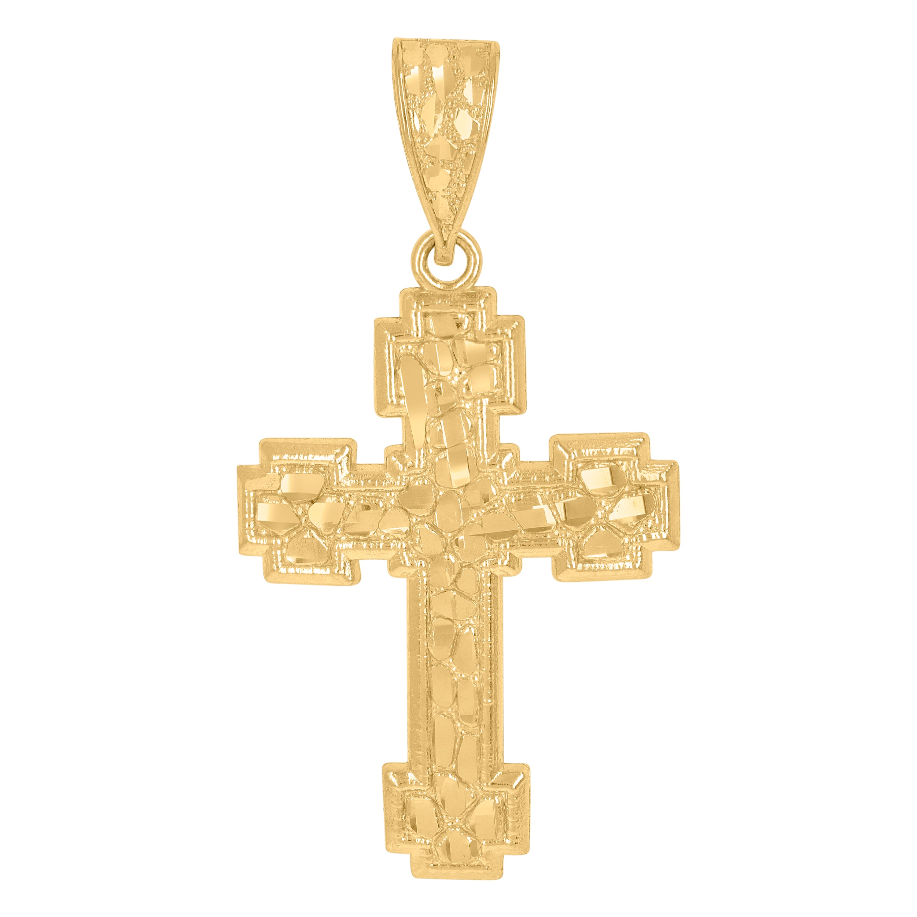 Elevate your style with this exquisite 10kt Yellow Gold Men's Cross Pendant. Weighing 4.4 grams, its intricate diamond-cut finish captures the light beautifully, adding a touch of sophistication to any look. Measuring 52.3MM in height and 27MM in width, this religious charm exudes elegance and strength. Designed with a single bail closure, it's perfect for daily wear or special occasions. A timeless piece that symbolizes faith and fashion, this pendant is a must-have addition to your jewelry collection.