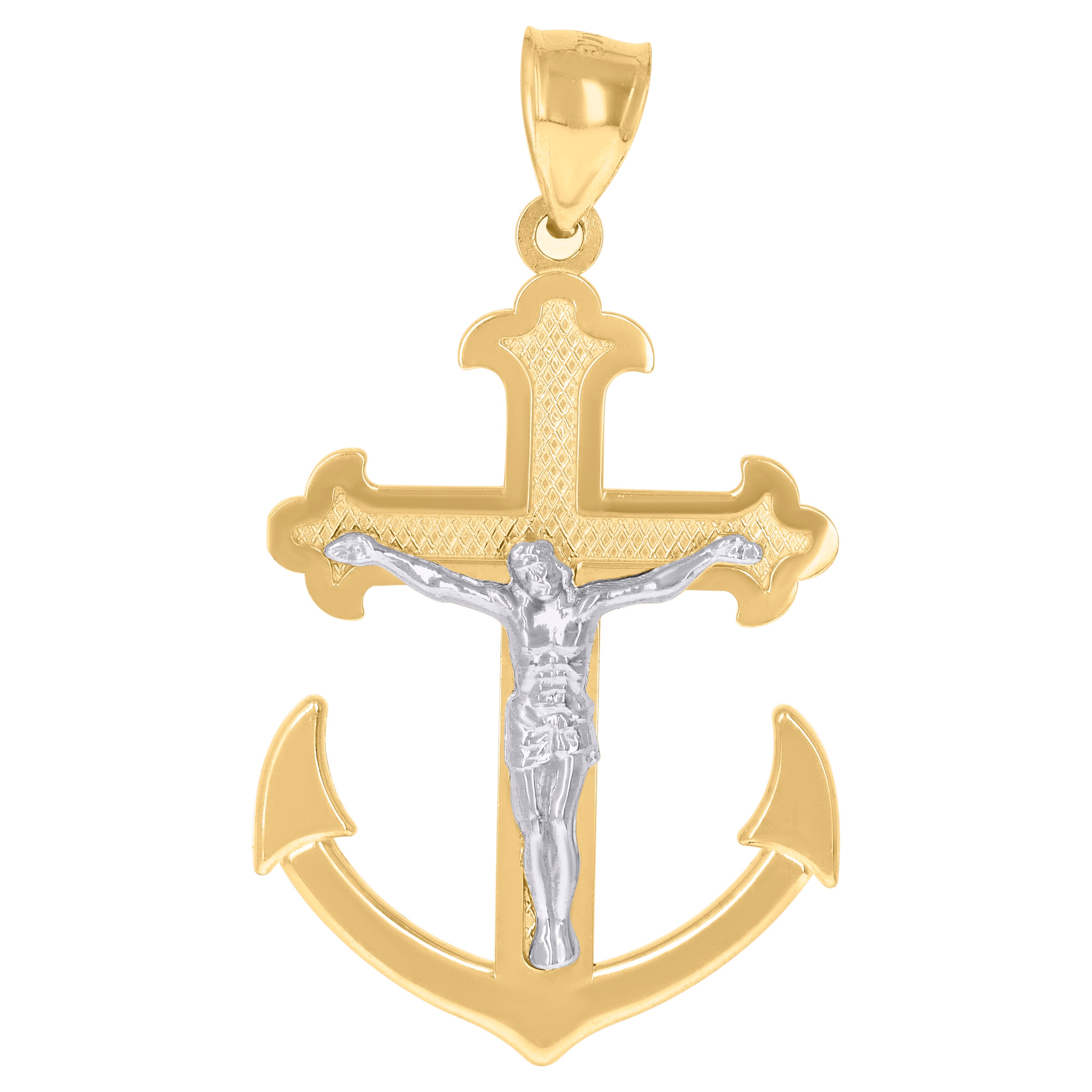 Elevate your style with this exquisite 10kt Two-Tone Gold Men's Crucifix Anchor Religious Charm Pendant. Weighing 4.6 grams, this polished piece boasts a striking design with a height of 44.9MM and a width of 25.2MM, offering a bold yet refined look. The single bail closure ensures secure wear, while the absence of CZ stones highlights the classic elegance and intricate detailing of the crucifix. Perfect for the modern man seeking a timeless accessory that speaks to both faith and fashion.