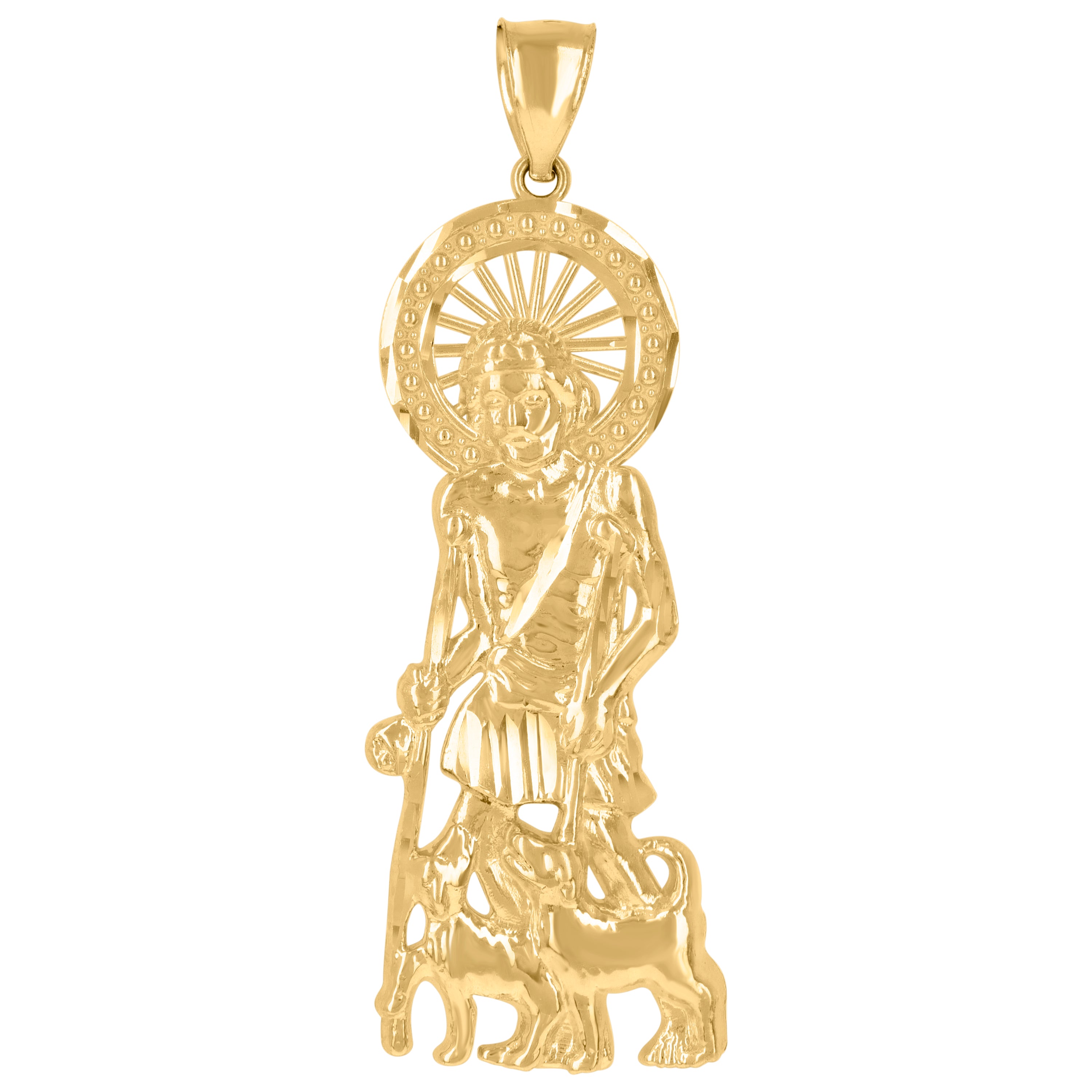 Exude elegance and faith with this exquisite 10kt Yellow Gold St. Lazarus Religious Charm Pendant. Weighing 4.9 grams, this pendant showcases a stunning diamond-cut finish that radiates brilliance. Its substantial dimensions of 59.8mm in height and 21.7mm in width make a bold statement, while the single bail closure ensures a secure fit. This charming piece, free of cubic zirconia, embodies simplicity and devotion, perfect for those seeking a meaningful accessory.
