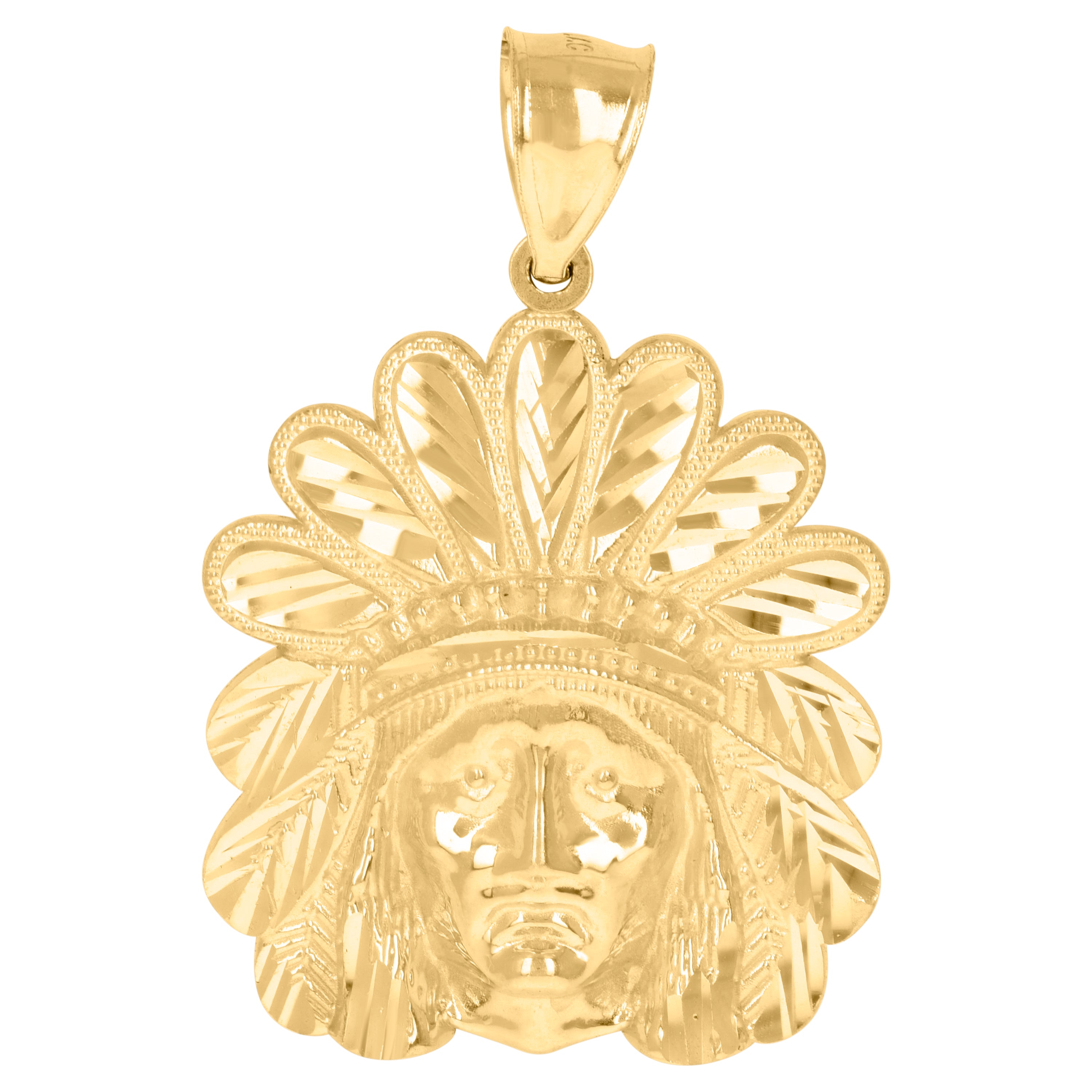 Discover elegance with our 10kt Yellow Gold Men's Native Indian Fashion Charm Pendant. Weighing 4.6 grams, this exquisite piece features a stunning diamond-cut finish that reflects light beautifully. Its design captures the spirit of native artistry, crafted with precision and care. The pendant measures 37.5MM in height and 24.4MM in width, offering a bold yet sophisticated statement. Designed with a single bail closure for easy wear, this pendant embodies timeless style and rich cultural heritage. Perfect for the modern man who appreciates classic, meaningful jewelry.