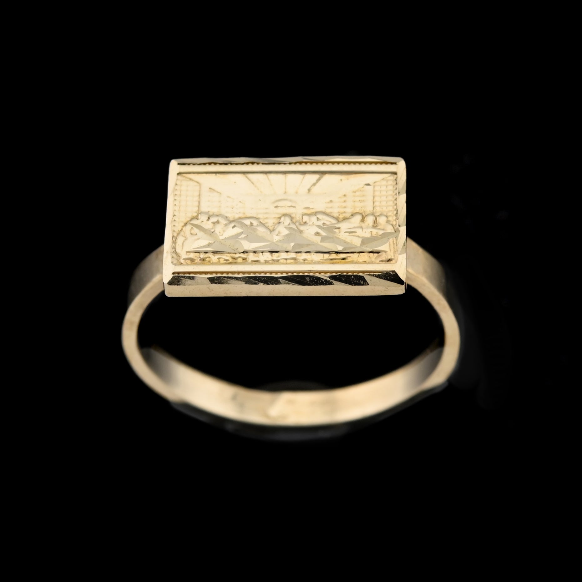 This striking 10kt yellow gold ring features an intricately detailed Last Supper design, capturing the reverence and spiritual significance of this sacred moment. Crafted with precision in genuine yellow gold, the ring showcases masterful artistry that brings the iconic religious scene to life. Perfect for men seeking meaningful jewelry that reflects their faith, this piece combines timeless elegance with profound symbolism. The substantial weight and quality construction ensure durability for everyday wear, while the sophisticated design makes it equally suitable for special occasions. A powerful statement of devotion and refined taste.
