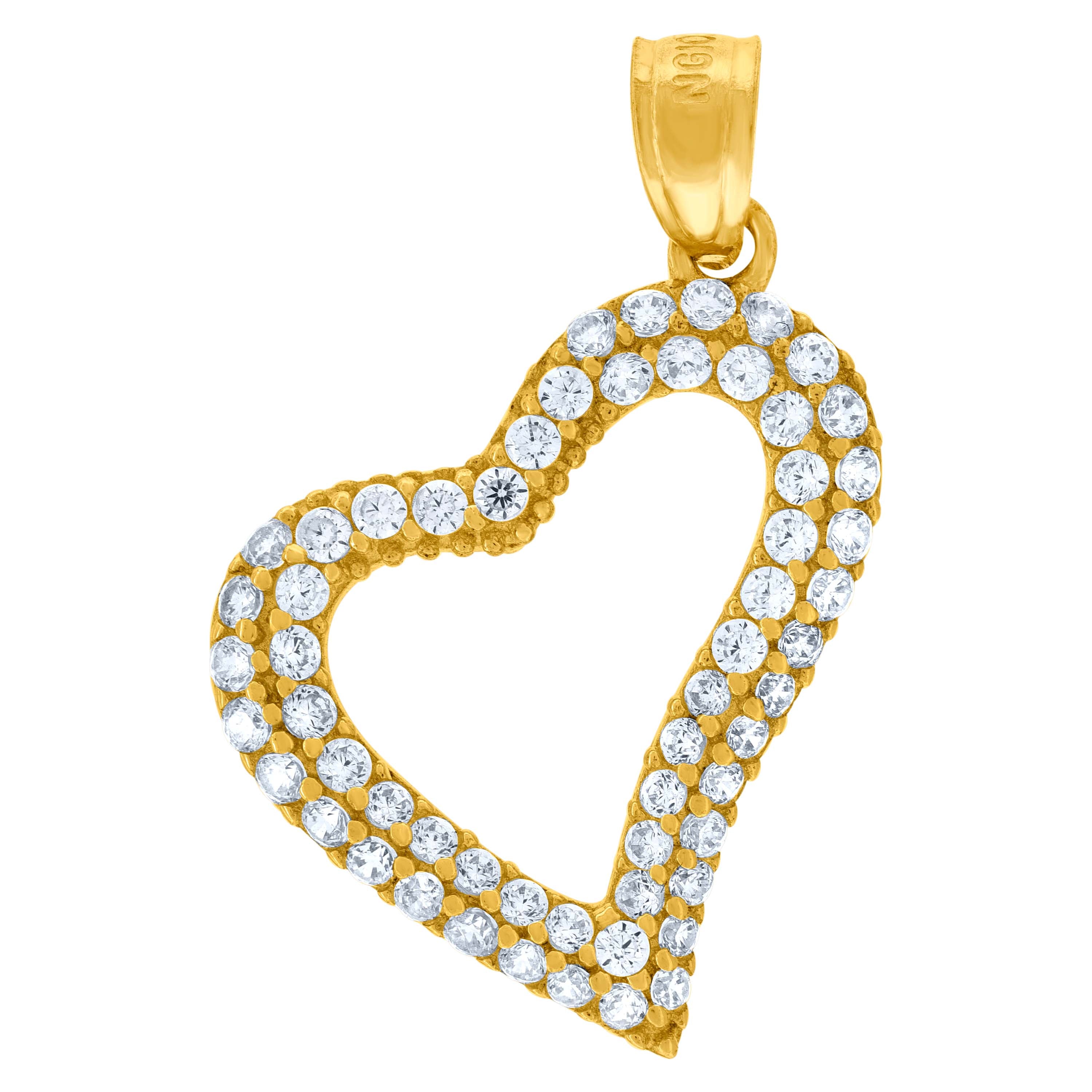 Illuminate your elegance with our exquisite 10Kt Gold Pendant, a timeless treasure crafted for the modern woman. This stunning heart charm pendant, made from 10kt real yellow gold, radiates sophistication and grace. Weighing a delicate 1.2 grams, its polished finish accentuates the beauty of the piece, while the brilliant white cubic zirconia, set in a secure prong setting, adds a sparkling touch of luxury. Perfectly sized with a height of 24.1MM and a width of 13.9MM, this pendant is designed to capture attention and hearts alike. Its single bail closure ensures it sits beautifully on any chain of your choice. Make this charming pendant yours and let it be the highlight of your jewelry collection.