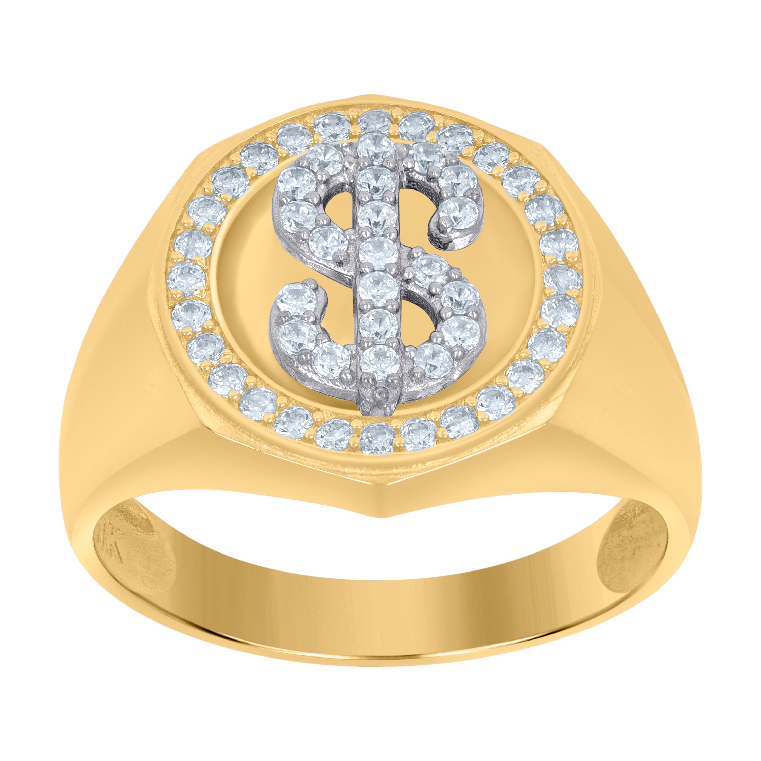 Elevate your style with this striking 10kt Two-Tone Gold Men's Ring, featuring bold Dollar Sign symbols adorned with dazzling white cubic zirconia. Weighing in at 4.9 grams, its polished finish and prong-set round stones ensure a sophisticated shine. Measuring 16.5MM in height and 3.6MM in width, this piece perfectly blends luxury with a unique flair, making it a standout addition to any jewelry collection.