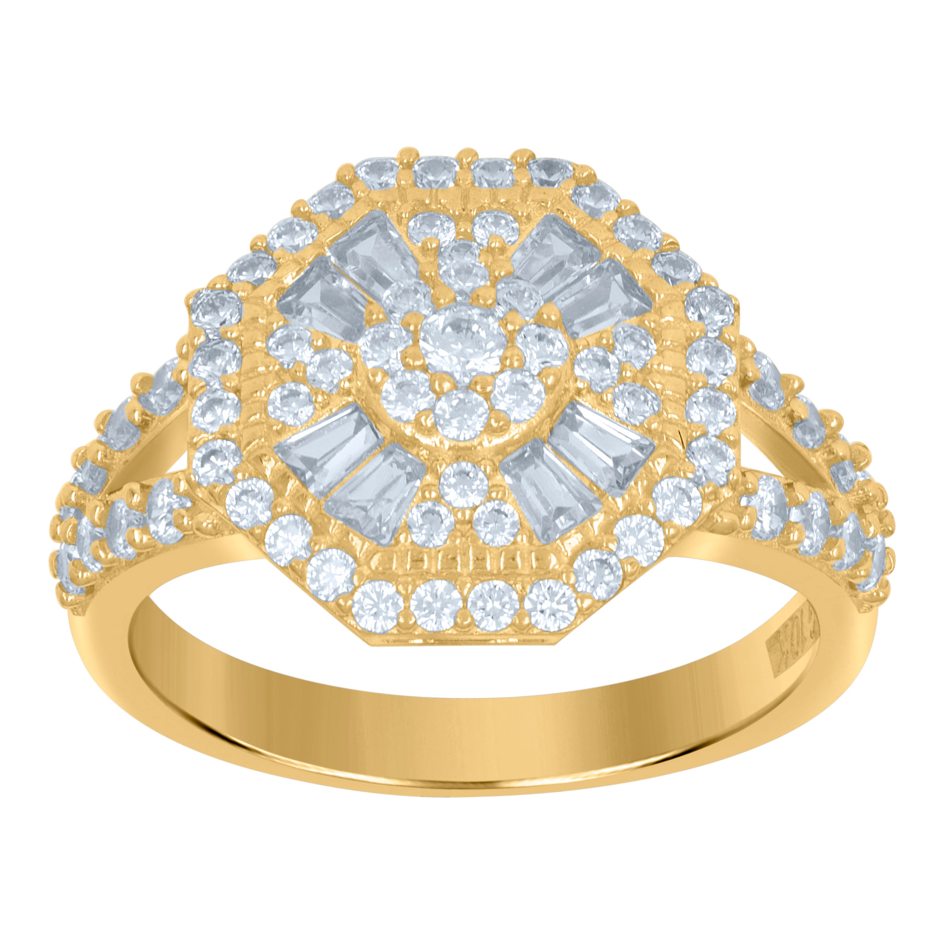 Elevate your style with this exquisite 10kt yellow gold fashion ring. Adorned with shimmering round and baguette cubic-zirconia stones, this polished masterpiece weighs 4 grams and boasts a graceful height of 13.2MM and a sleek width of 2.5MM. The prong setting enhances the brilliance of the sparkling white stones, making it a captivating addition to any jewelry collection. Perfect for making a sophisticated statement on any occasion.