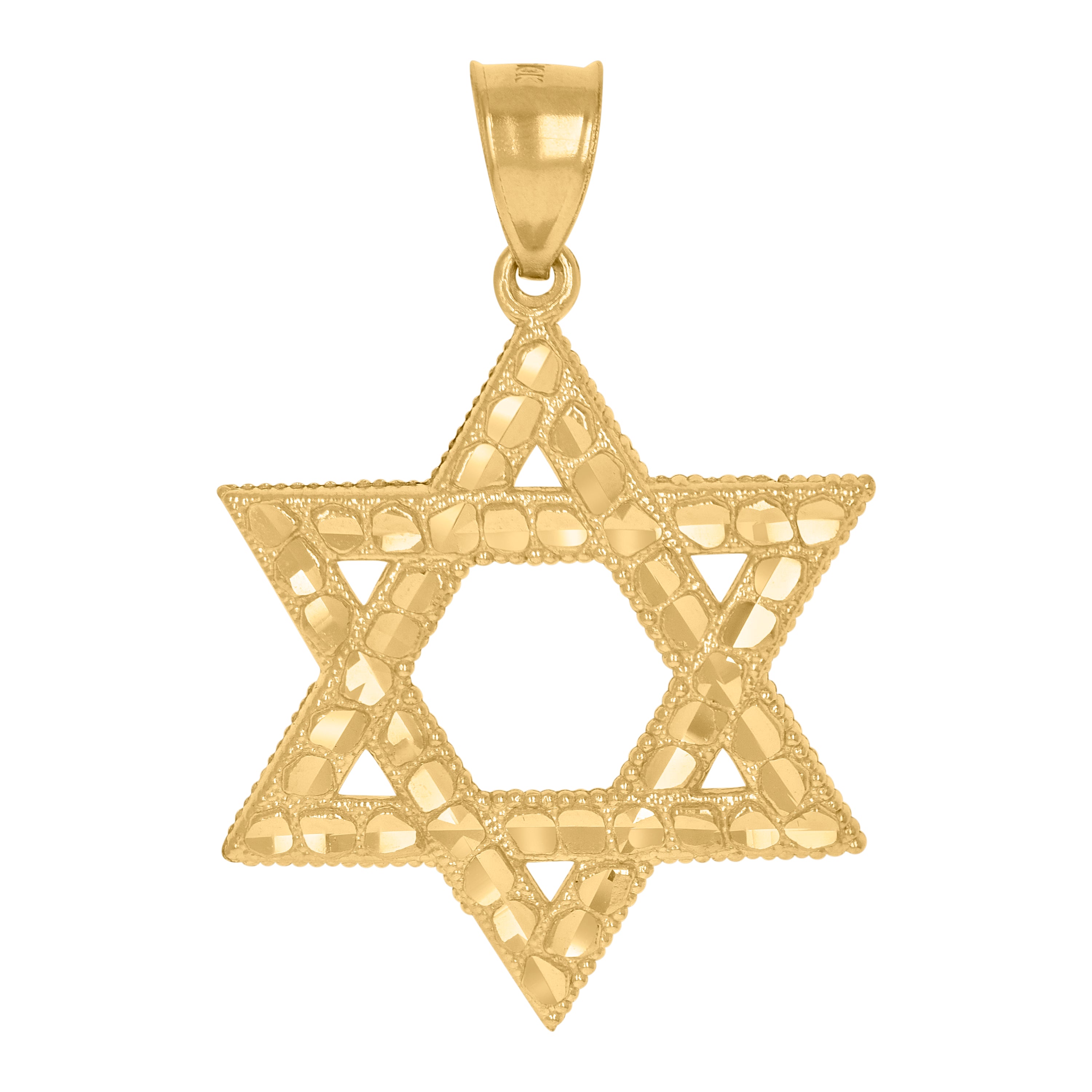 Elevate your jewelry collection with this striking 10kt yellow gold Star of David pendant, expertly crafted for the discerning gentleman. The textured nugget design adds dimensional appeal and authentic character to this meaningful religious symbol. Suspended from a sturdy bail, this charm pendant makes a powerful personal statement while maintaining refined elegance. Perfect as a standalone piece or layered with other chains, it combines spiritual significance with timeless style. An ideal gift for those seeking to express their faith with understated sophistication.