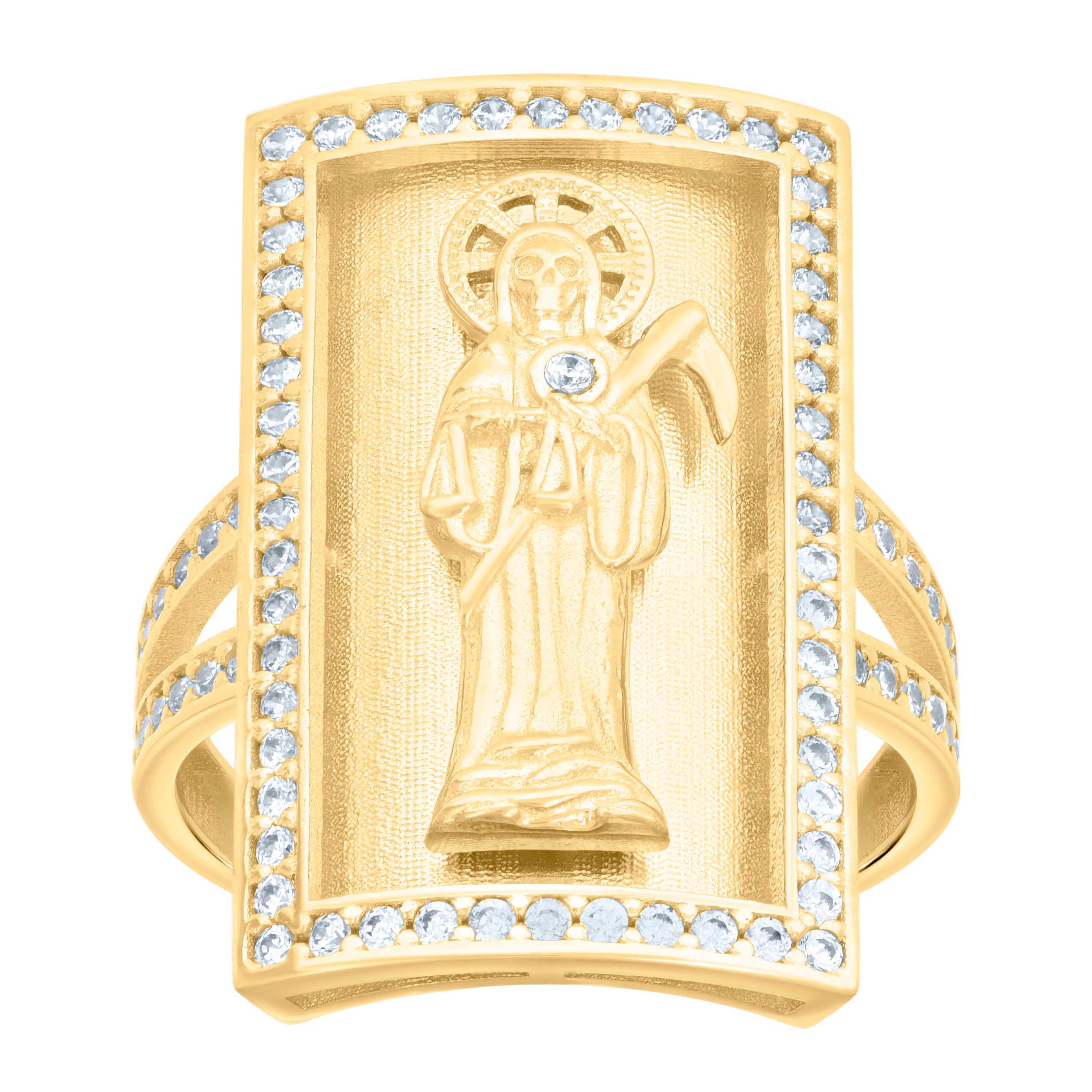 Embrace the allure of the mystical with this stunning 10kt Yellow Gold Women's Ring, featuring a captivating Death Angel Santa Muerte Grim Reaper design. Weighing 4.3 grams, this polished masterpiece exudes elegance and strength. The ring boasts a sparkling round white cubic zirconia, securely set in prong/bezel settings, adding a touch of divine light to the intricate shield motif. With dimensions of 23.9MM in height and 14.3MM in width, this ring is a bold statement piece that marries spirituality with style. Perfect for those who appreciate unique, symbolic jewelry.