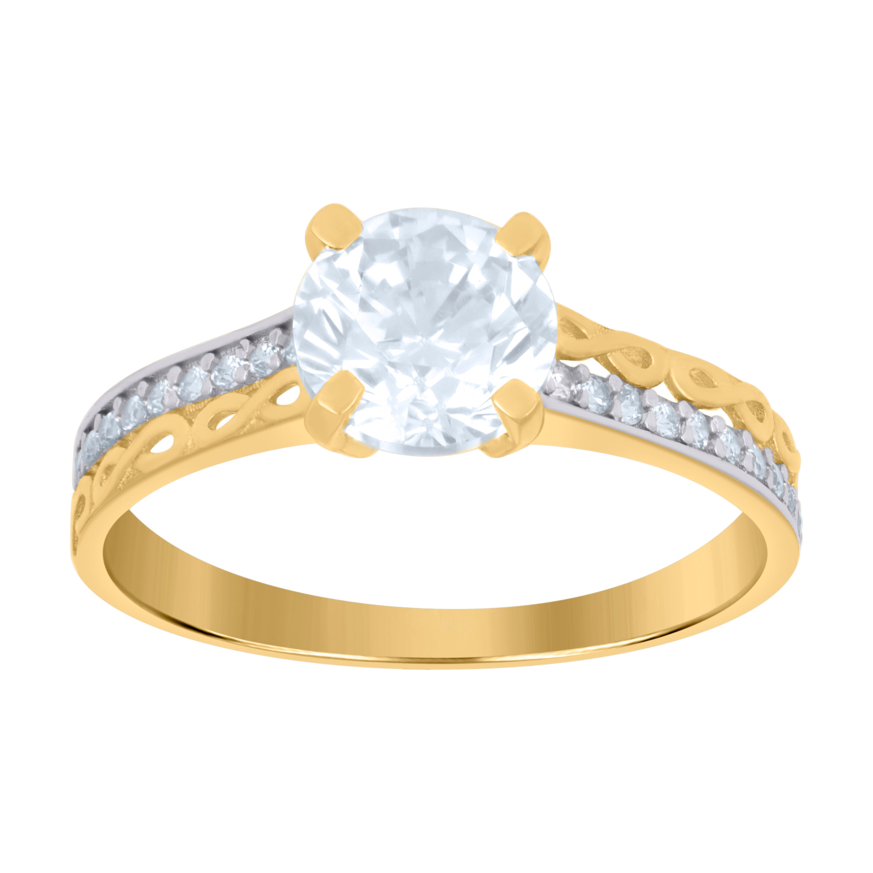 Celebrate the promise of forever with this exquisite 10kt Two-tone Gold Women's Bridal Engagement Ring. Weighing a graceful 1.7 grams, this polished masterpiece boasts a striking 6.5MM round white cubic zirconia, elegantly set in prongs to maximize its brilliance. A symbol of timeless elegance, this ring is the perfect blend of sophistication and romance.