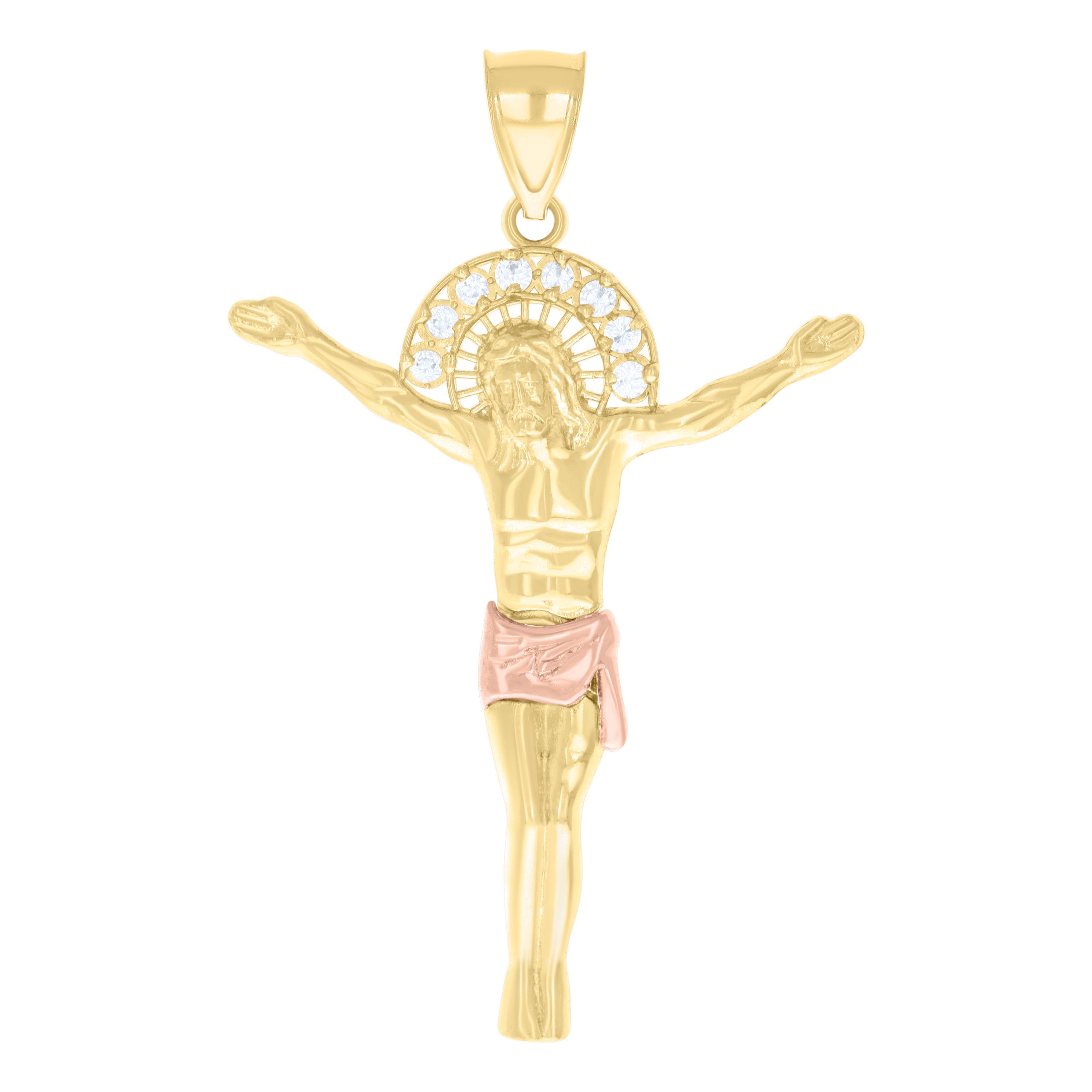 Elevate your style with this exquisite 10kt Two-tone Gold Men's Pendant featuring the revered Jesus Christ Body design. Crafted with precision, this religious charm is adorned with sparkling white round Cubic-Zirconia stones set in prongs, offering a radiant shine that captivates. With a polished finish, this piece measures 51.5MM in height and 32.5MM in width, perfectly balancing elegant simplicity and spiritual symbolism. The single bail closure ensures a secure fit, making it a timeless addition to any jewelry collection. Weighing 3 grams, this pendant is a testament to both faith and fashion.