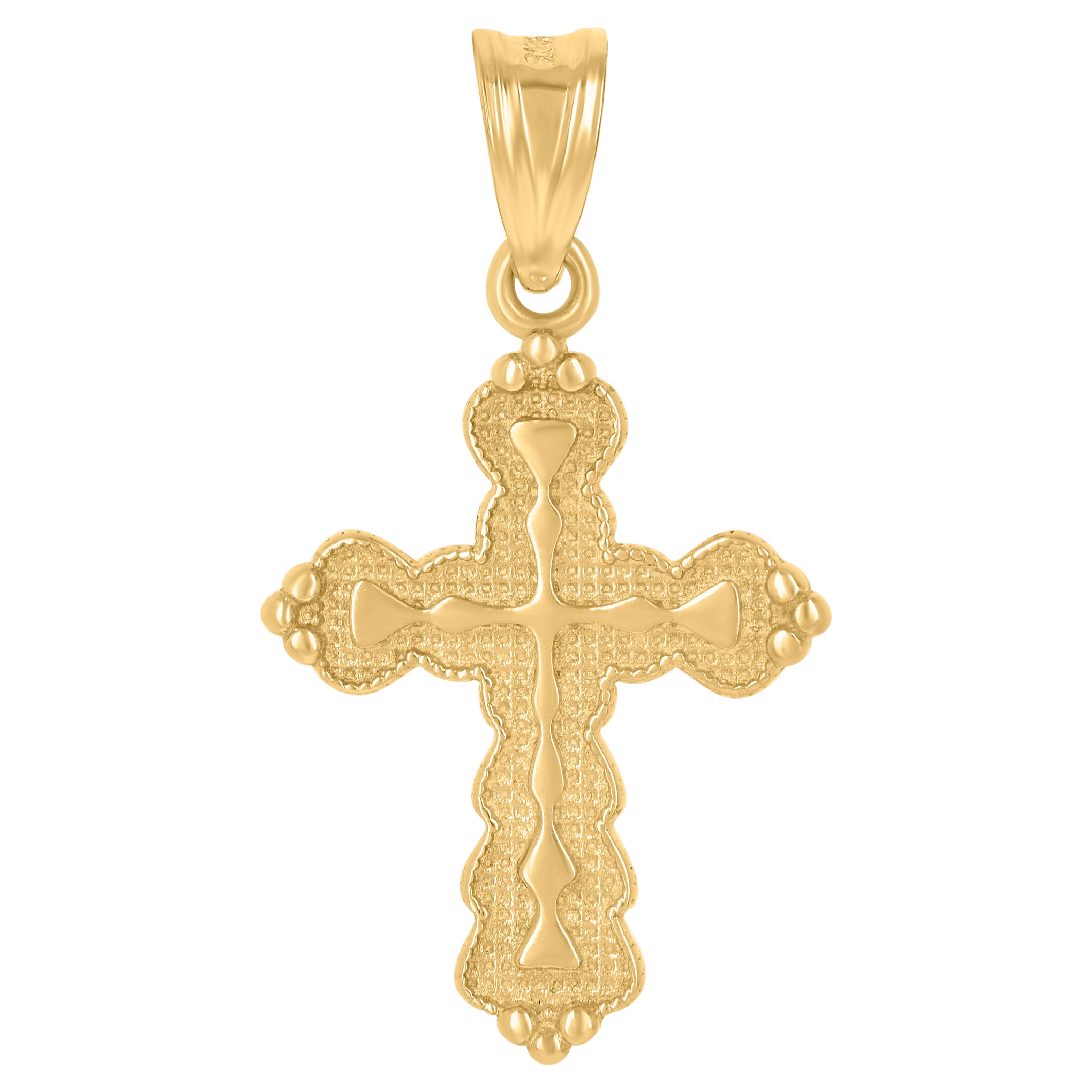 Elevate your style with our exquisite 10Kt Gold Pendant, a timeless piece crafted from pure 10kt real yellow gold. This unisex cross religious charm pendant embodies elegance and spirituality, making it a perfect accessory for any occasion. Weighing just 1.2 grams, it offers a comfortable wear without compromising on its luxurious appeal. The textured finish adds a sophisticated touch, while the single bail ensures a secure fit. Measuring 27MM in height and 14.6MM in width, this pendant is the ideal size to make a subtle yet significant statement. Embrace the allure of gold and add this charming piece to your jewelry collection today!