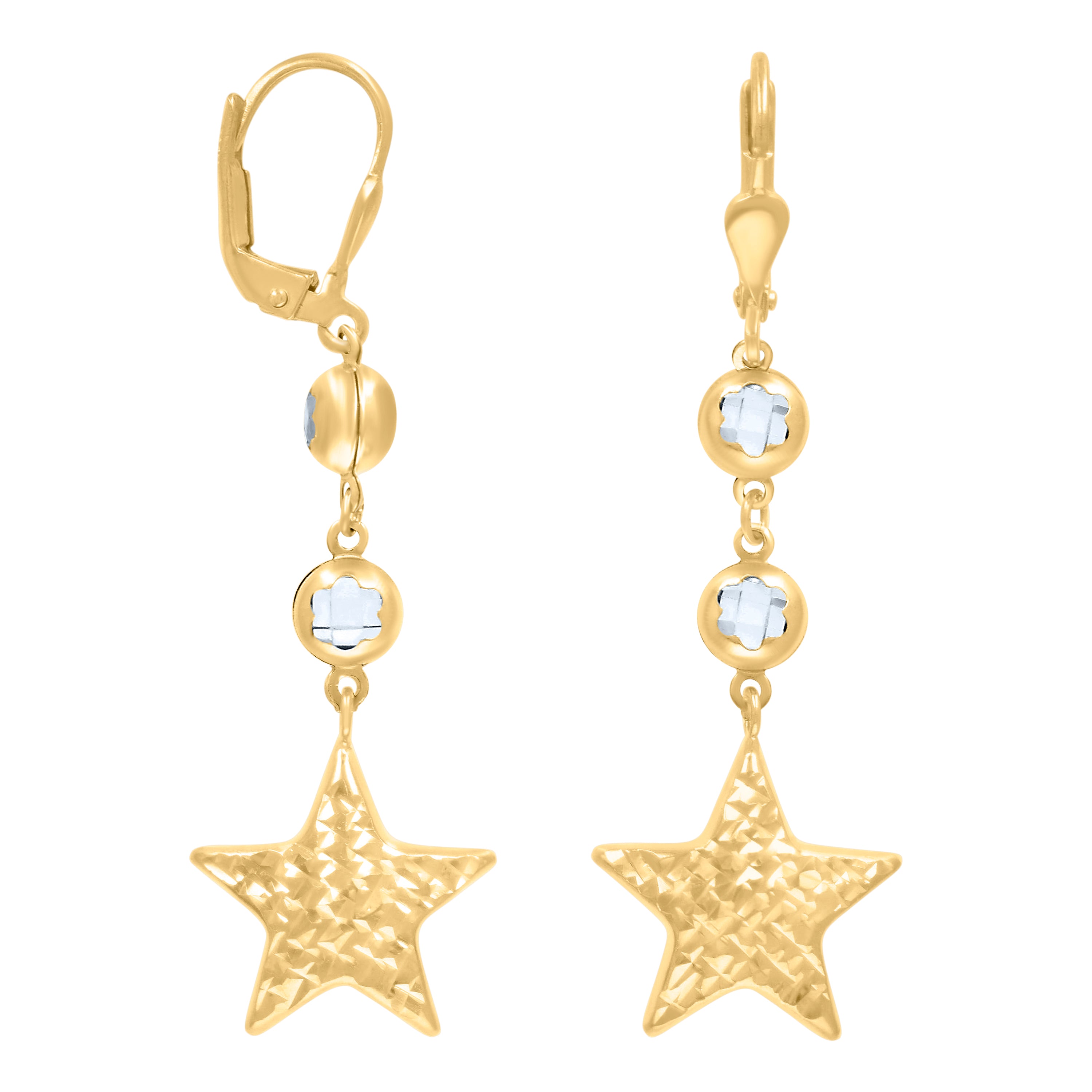 Elevate your style with these exquisite 10Kt Gold Earrings, designed for the modern woman who appreciates elegance and glamour. Crafted from pure 10kt real yellow gold, these earrings feature a stunning diamond-cut finish that sparkles with every movement. The eye-catching star dangle design is adorned with brilliant round white cubic zirconia set in a secure bezel setting, ensuring they catch the light beautifully. Weighing 4.2 grams, they offer a comfortable yet luxurious feel. The leverback closure provides both security and ease of wear, making these earrings perfect for any occasion. Measuring 48.4MM in height and 15MM in width, they are the ideal statement piece to enhance your ensemble. Treat yourself or a loved one to these captivating earrings that blend timeless style with modern sophistication.