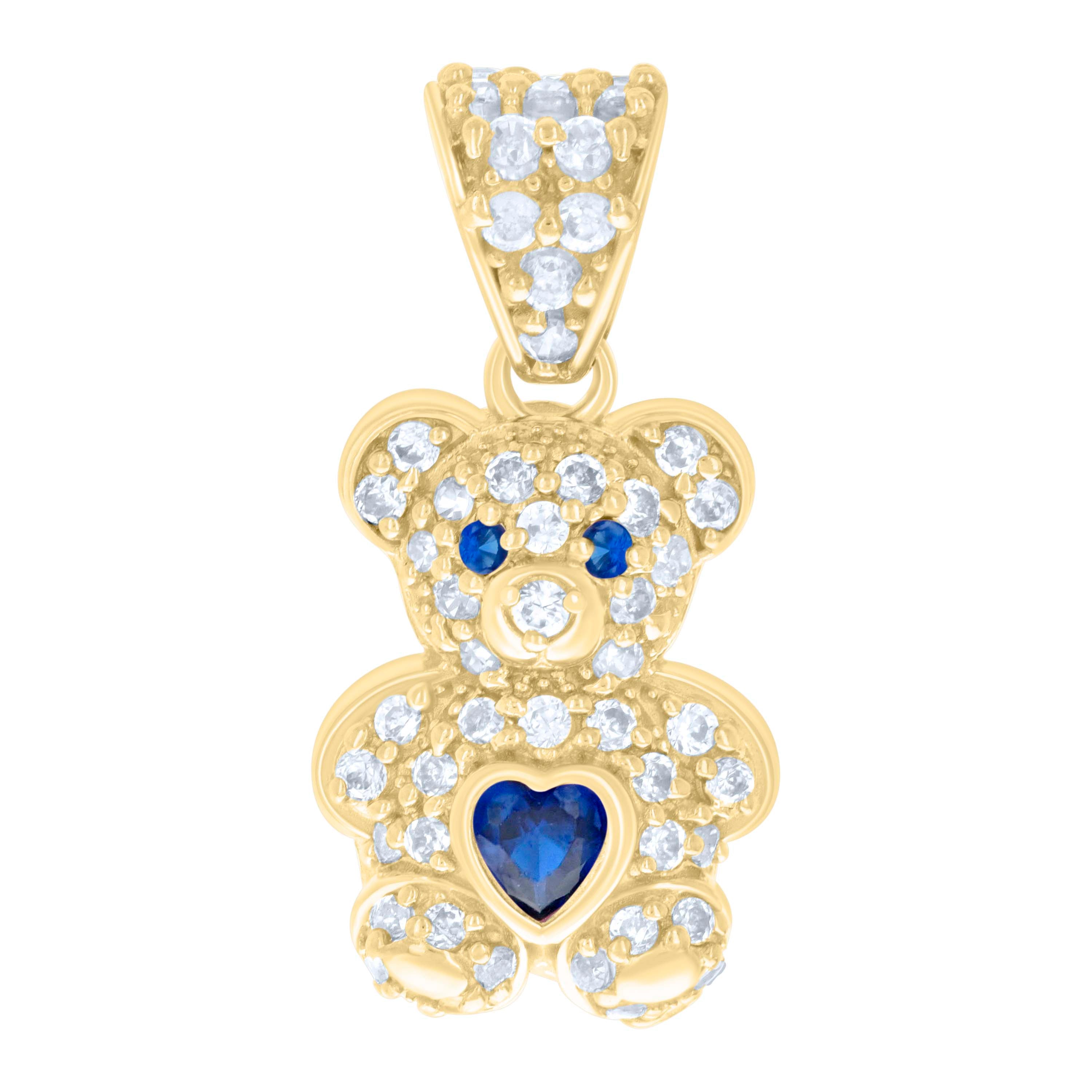 Introducing our exquisite 10Kt Gold Cz Pendant, a dazzling piece perfect for the sophisticated woman. Crafted from pure 10k yellow gold, this pendant features a charming teddy bear design adorned with striking blue and white heart and round cubic-zirconia stones, representing the September birthstone. Weighing just 1.5 grams, this polished pendant is light yet durable. Its elegant single bail closure makes it easy to wear, while the prong/bezel setting ensures the stones are secure and sparkling. Measuring 20.3MM in height and 9.7MM in width, this pendant is a stunning addition to any jewelry collection, effortlessly enhancing your elegance and style. Embrace the perfect blend of whimsy and luxury with this beautiful pendant.
