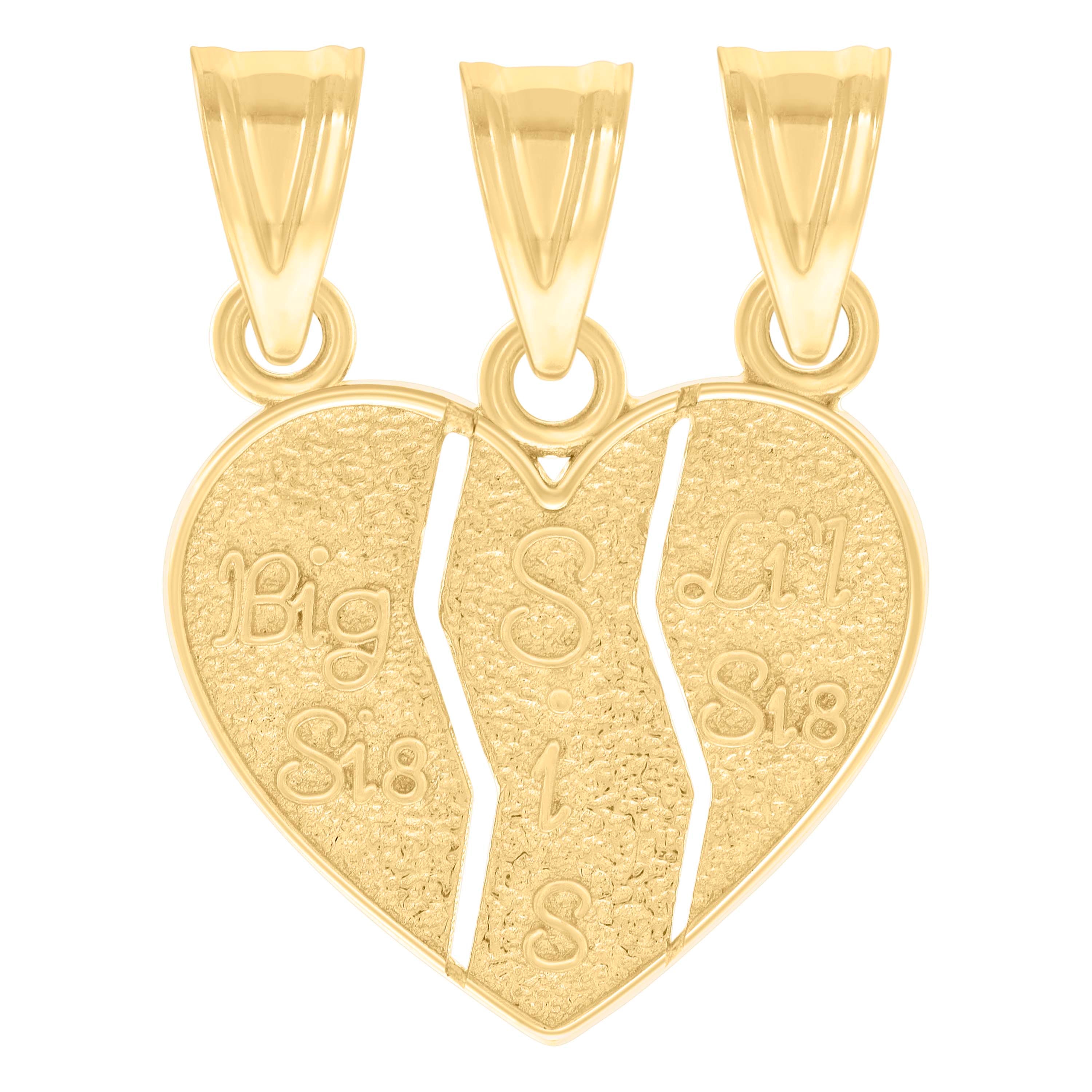 Celebrate the unbreakable bond with our 10Kt Gold Pendant, designed for cherished connections between sisters. Crafted from pure 10kt real yellow gold, this pendant features a heart-shaped charm that beautifully breaks apart to reveal "Big Sis" and "Lil Sis" engravings, symbolizing everlasting family ties. With a textured finish, this pendant adds a touch of elegance and sentimentality to any outfit. Weighing 1.9 grams, it offers a delicate yet durable design. The triple bail closure ensures secure wear and versatility. Measuring 21.3MM in height and 16.7MM in width, its sleek, CZ-free design is perfect for the modern woman. A heartfelt gift to treasure forever.