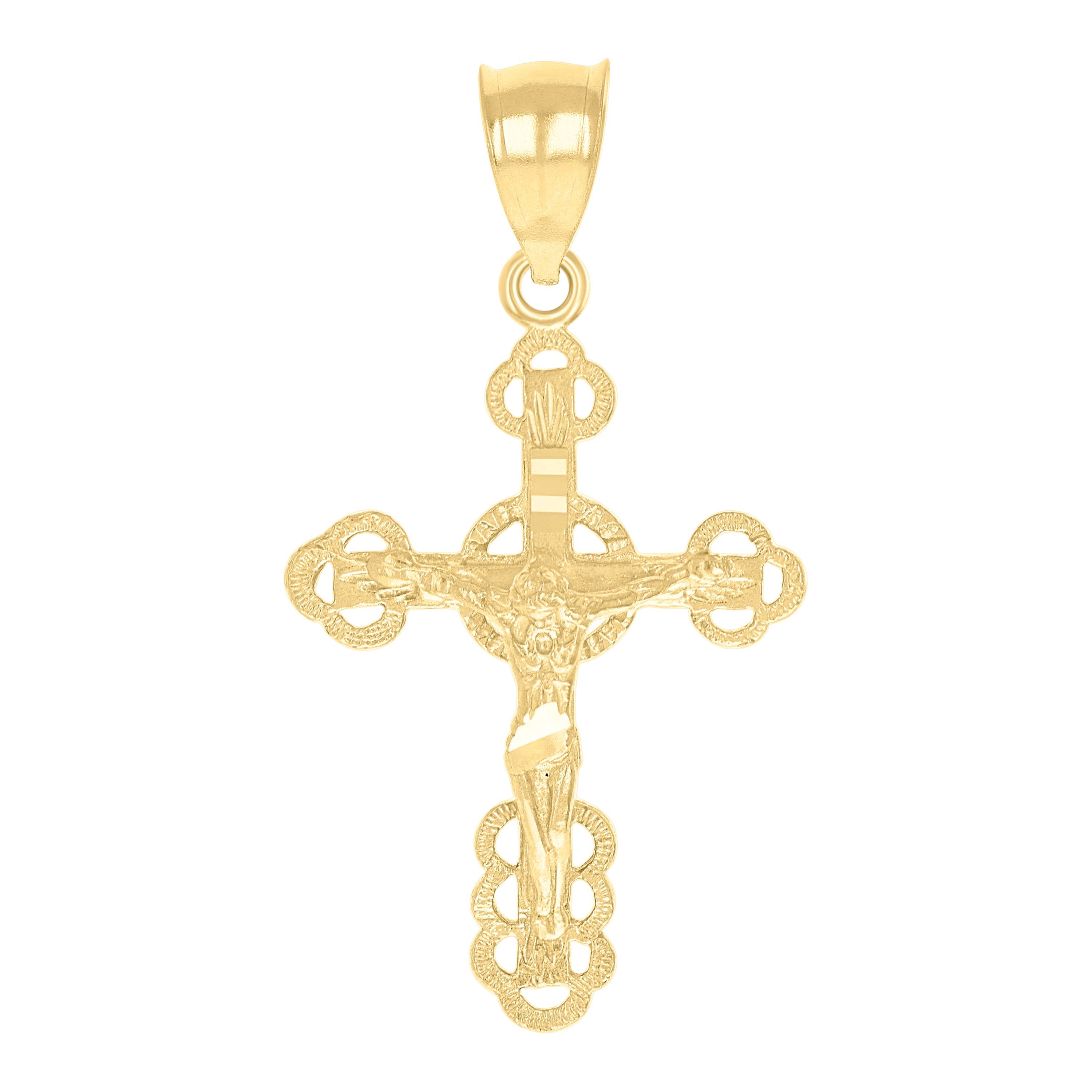 Elevate your faith and style with our exquisite 10Kt Gold Pendant, a masterpiece of elegance and devotion. Crafted from real 10kt yellow gold, this women's crucifix cross charm pendant is a timeless symbol of religious significance and sophistication. Weighing a delicate 1.8 grams, it boasts a textured finish that adds a touch of intrigue and depth. The pendant is designed with a single bail closure, ensuring it hangs gracefully around your neck. Measuring 34.4mm in height and 19.1mm in width, it offers a perfect balance of presence and subtlety. Whether for daily wear or special occasions, this pendant is a beautiful testament to your faith and style, a must-have addition to any jewelry collection.