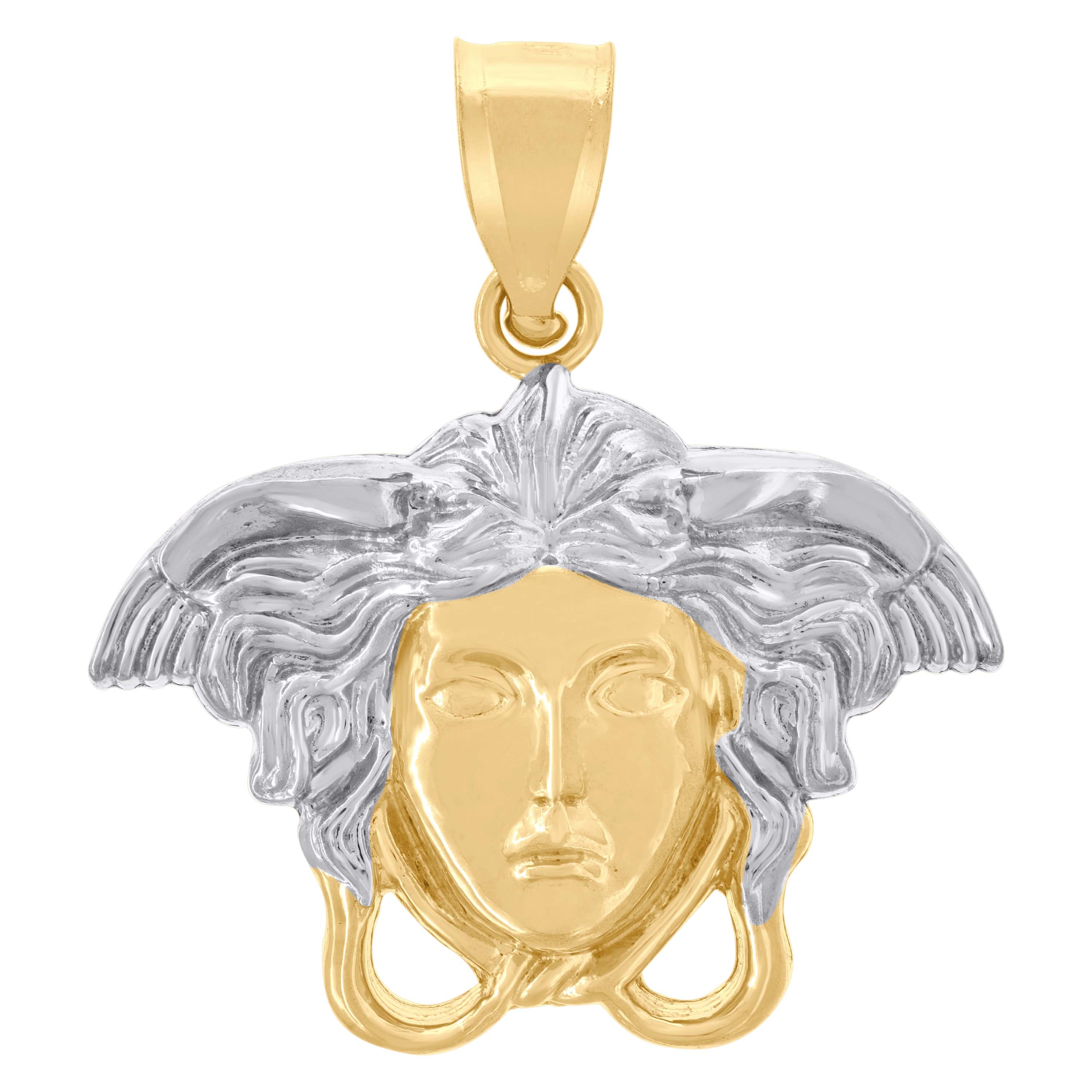 Elevate your style with this exquisite 10Kt Real Two-tone Gold Men's Medusa Egyptian Fashion Charm Pendant. Crafted from pure 10k gold, this pendant features a captivating blend of yellow and white tones, offering a striking contrast that catches the eye. Weighing just 1.6 grams, it ensures comfortable wear throughout the day. The polished finish adds a touch of elegance, while the intricate Medusa design brings a hint of ancient allure to your look. Measuring 23MM in height and 20.9MM in width, this pendant is perfect for making a bold statement without being overwhelming. The single bail closure allows for easy attachment to your favorite chain. Whether for daily wear or special occasions, this pendant is a timeless addition to any jewelry collection.