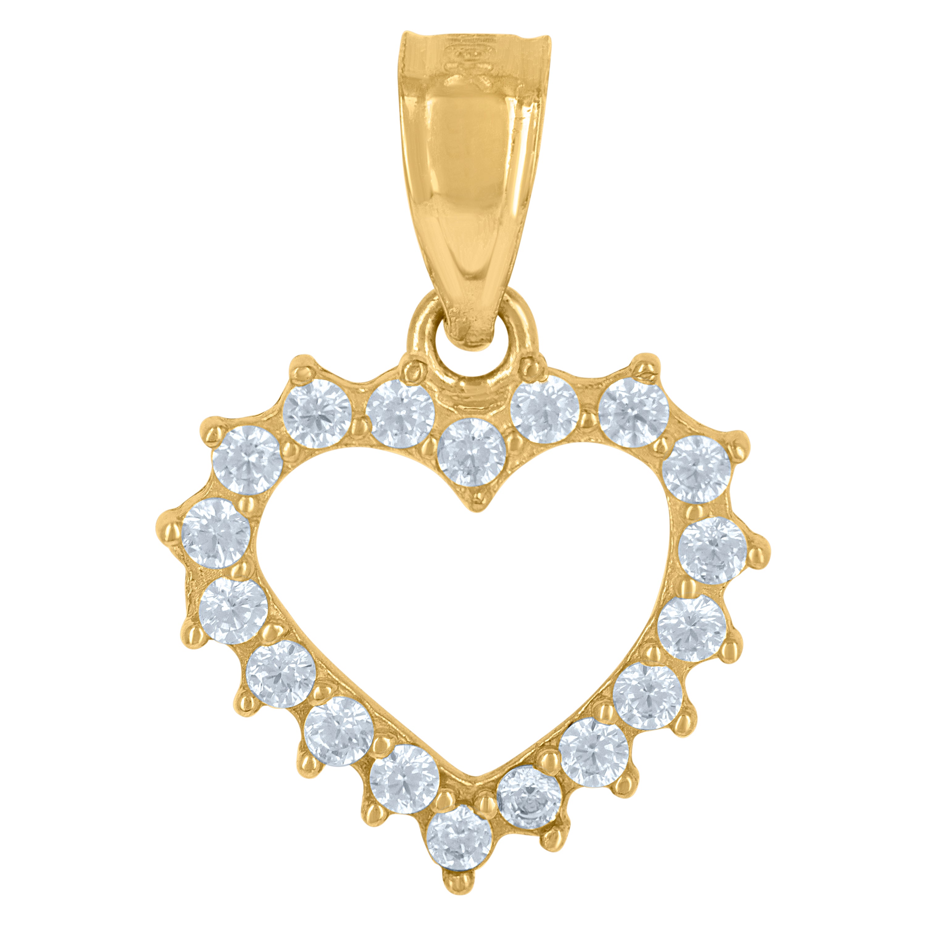Illuminate your neckline with this exquisite 10kt Yellow Gold Open Heart Pendant. Adorned with a sparkling round white cubic zirconia, this polished charm exudes elegance and romance. Its lightweight design at 0.5 grams ensures comfort, while the single bail closure makes it easy to wear. Measuring 15.5MM in height and 11.6MM in width, this enchanting piece is the perfect blend of sophistication and subtlety, ideal for any occasion.