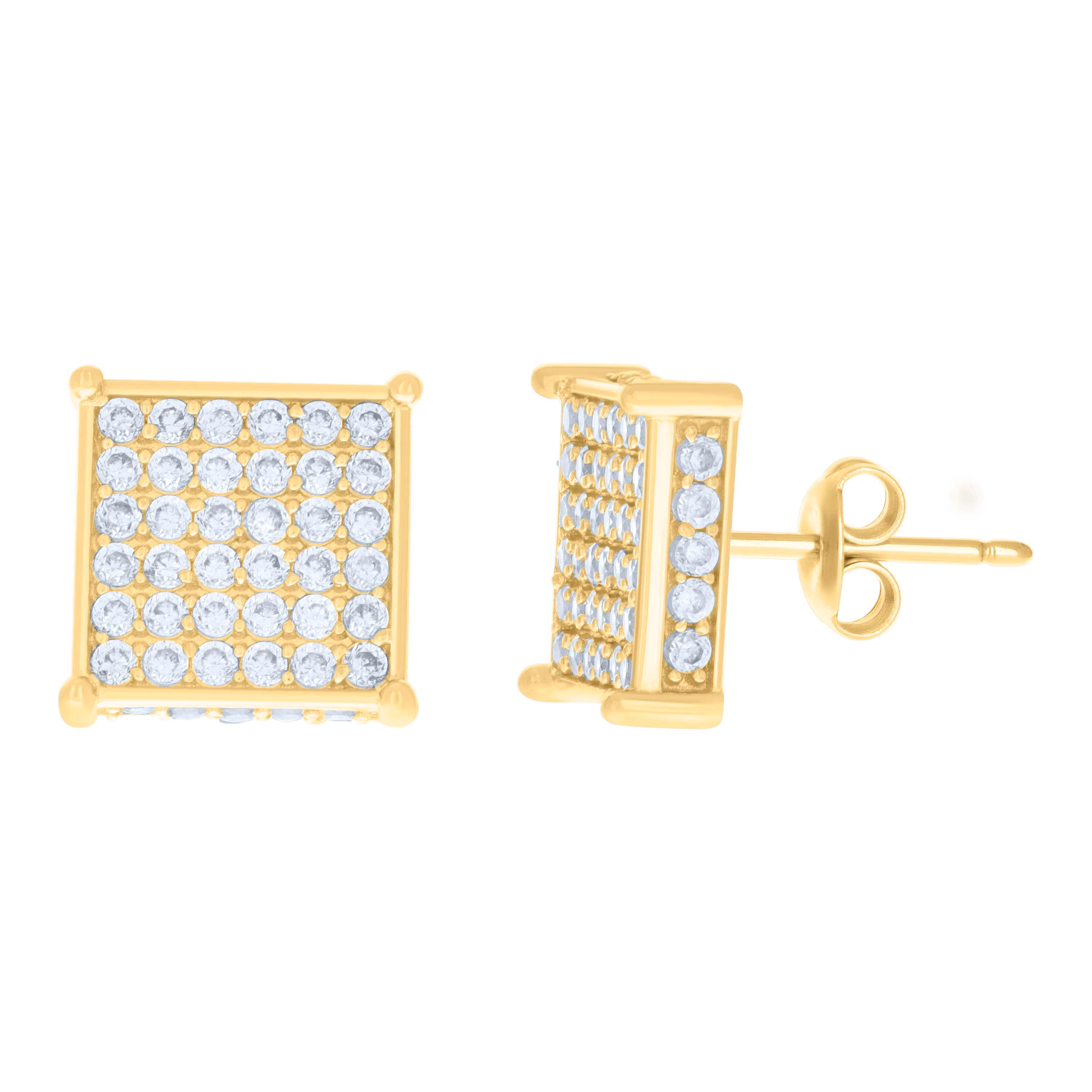 Indulge in the timeless elegance of our 10Kt Gold CZ Earrings, meticulously crafted for the modern woman. These stunning fashion stud earrings feature a striking square design, enhanced by dazzling white round cubic zirconia stones that sit elegantly in a prong setting. Made from pure 10kt yellow gold, they are both lightweight and durable, weighing just 3.5 grams. The polished finish adds a touch of sophistication, while the secure push-back closure ensures comfort and ease of wear. Measuring 10.8MM in both height and width, these earrings are the perfect blend of classic charm and contemporary style. Ideal for any occasion, they promise to add a touch of glamour to your everyday or special event ensemble. Treat yourself or a loved one to this exquisite accessory today.