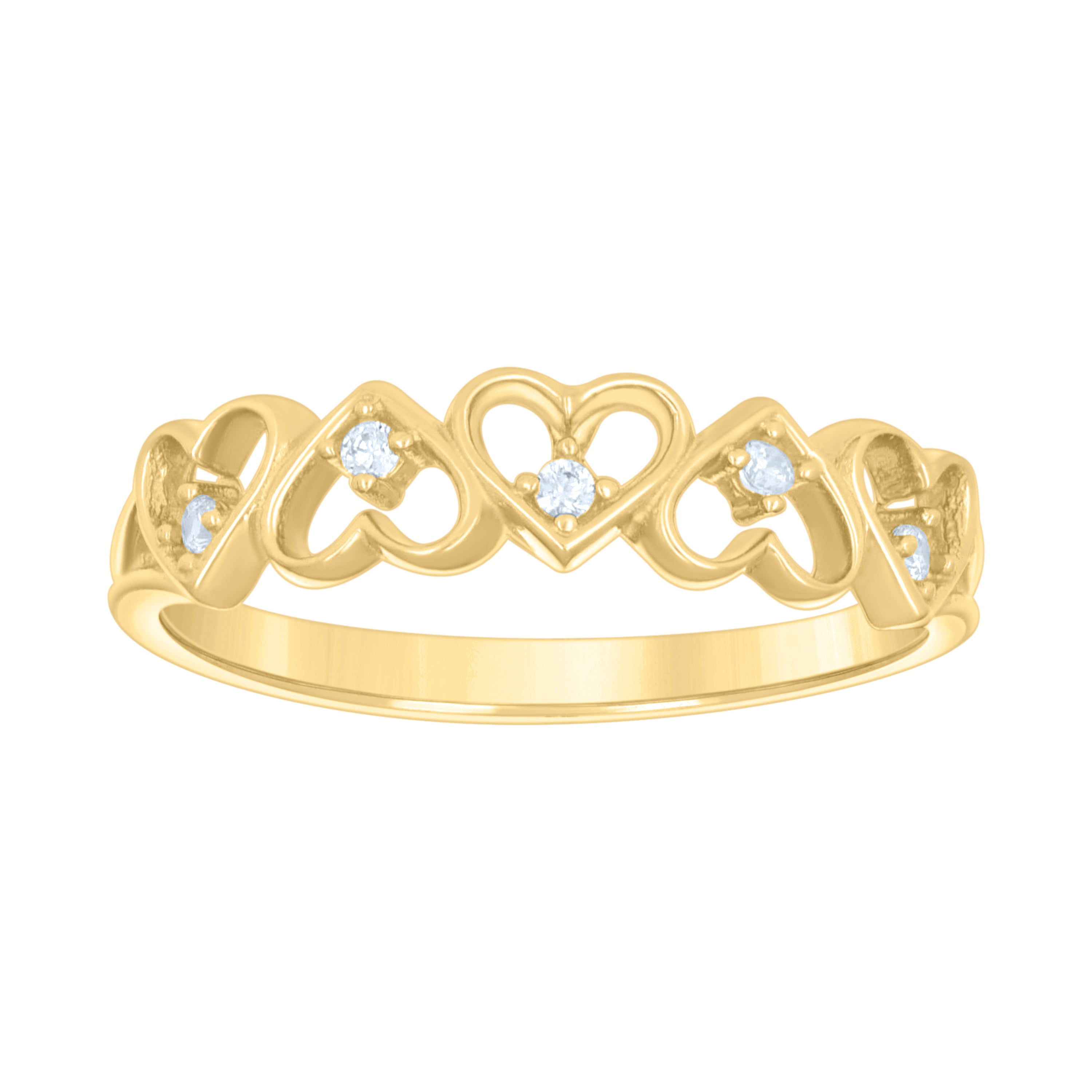 Embrace elegance with the 10Kt Gold Cz Ring, a true symbol of love and sophistication. Crafted from genuine 10kt yellow gold, this exquisite women's ring features a polished finish and a delicate arrangement of multiple heart motifs. At its center, a brilliant white round cubic zirconia sparkles brightly, set in a secure prong setting. With a lightweight design of just 1.4 grams, and dimensions of 4.6MM in height and 1.9MM in width, it promises comfort and style. Perfect for any occasion, this ring is a timeless addition to your jewelry collection, capturing the essence of love with every glance.