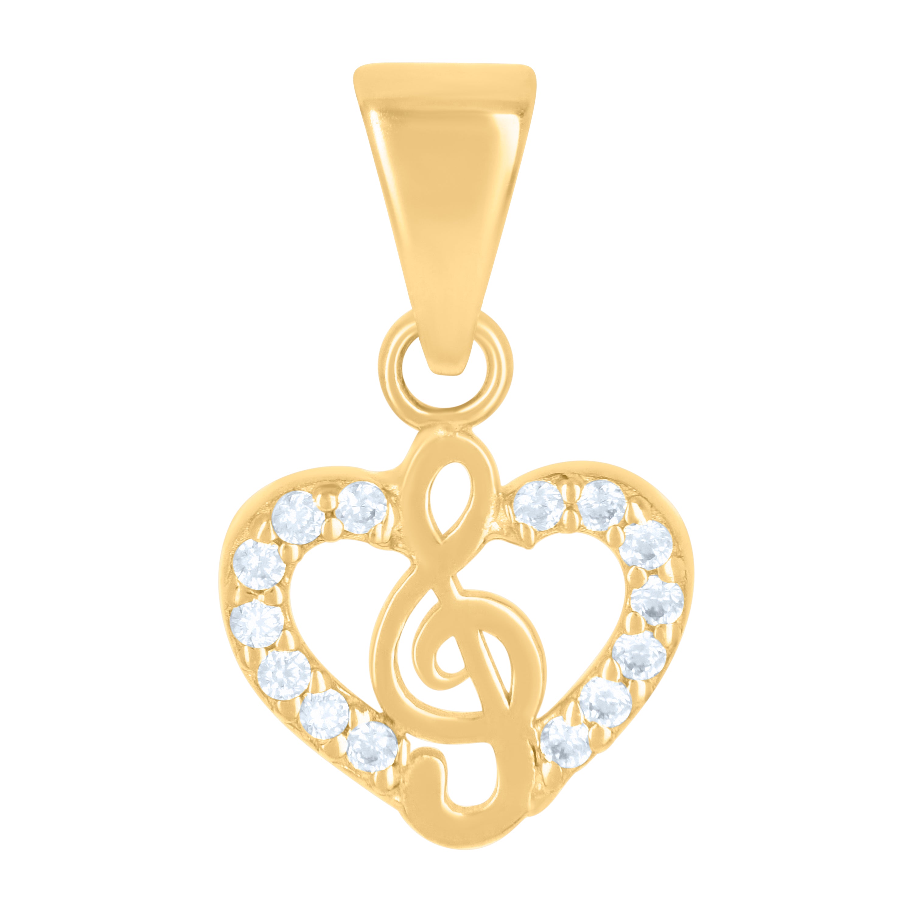 Enhance your elegance with our exquisite 10Kt Gold Turkish Pendant, a stunning piece crafted for the modern woman. This charming pendant features a treble clef intertwined with a heart, symbolizing harmony and love. Made from genuine 10kt yellow gold, it exudes a warm and luxurious glow. The pendant is adorned with sparkling white cubic zirconia, delicately set in prong settings to ensure maximum brilliance. With a polished finish, this piece catches the light beautifully, adding a touch of sophistication to any outfit. Weighing just 0.6 grams, it offers lightweight comfort without compromising on style. Measuring 16.4MM in height and 9.6MM in width, it is the perfect size for a subtle yet eye-catching accessory. The single bail closure ensures easy attachment to your favorite chain. Elevate your jewelry collection with this unique and timeless pendant, a perfect gift for yourself or a loved one.
