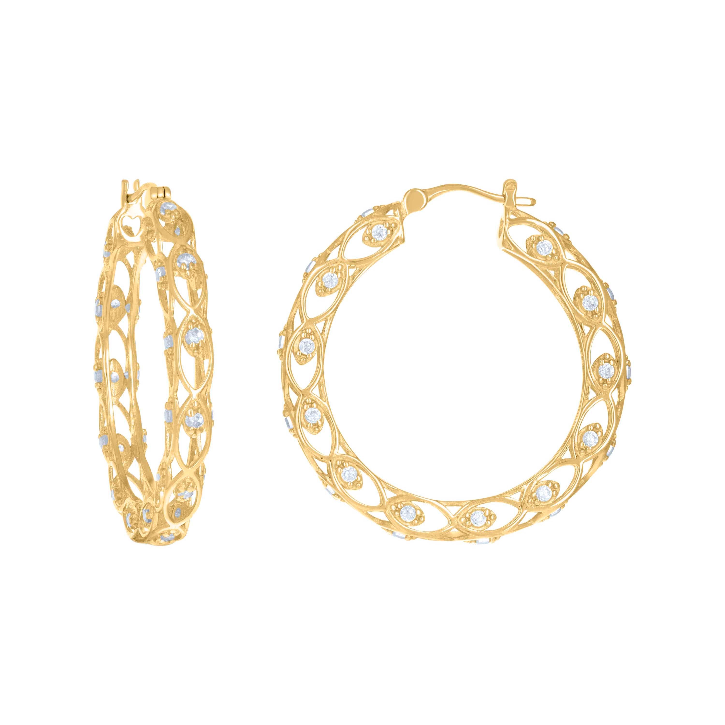 Weighing 4.4 grams, these earrings boast a substantial feel without being overly heavy. The 29.9MM height and 28MM width/thickness make them a standout accessory suitable for any occasion. Each earring is adorned with round, prong-set cubic zirconia stones in a brilliant white hue, adding a touch of sparkle and sophistication.