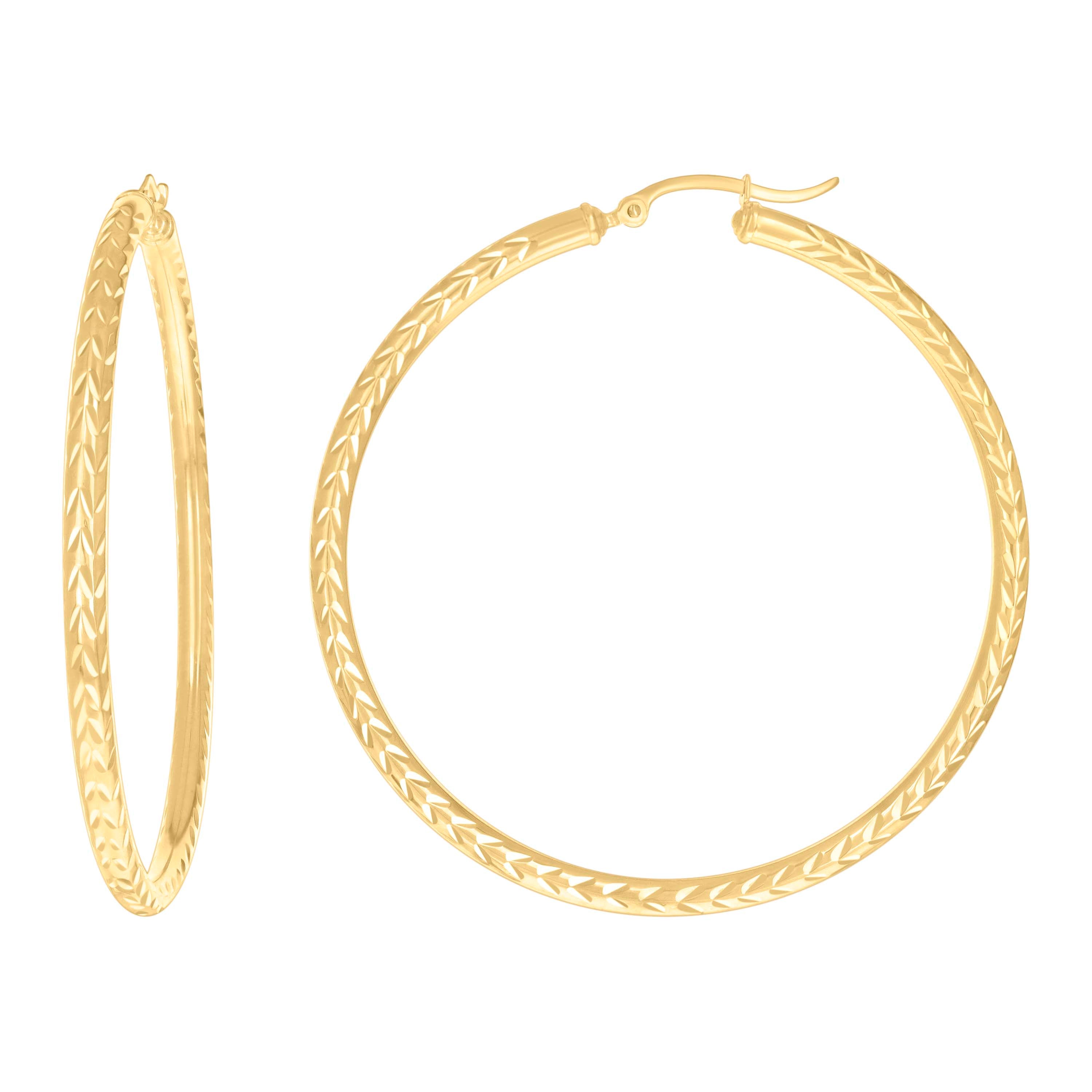 Elevate your elegance with these exquisite 10kt Yellow Gold Women's Diamond-Cut Round Tube Patterned Hoop Earrings. Crafted with precision and designed for the modern woman, these hoops are the perfect blend of sophistication and style. Measuring 57 mm in height and 3 mm in thickness, their dazzling diamond-cut finish captures light beautifully, adding a touch of sparkle to your ensemble. The round tube design is both timeless and contemporary, ensuring these earrings remain a staple in your jewelry collection for years to come. Securely fastened with a hinged back closure, they promise comfort and ease of wear for any occasion. At a weight of 3.9 grams, they are light enough for all-day wear while still making a statement. Perfect for a night out or a day at the office, these earrings are a versatile addition to any jewelry wardrobe. Embrace the luxury of yellow gold and let these hoops enhance your natural beauty.