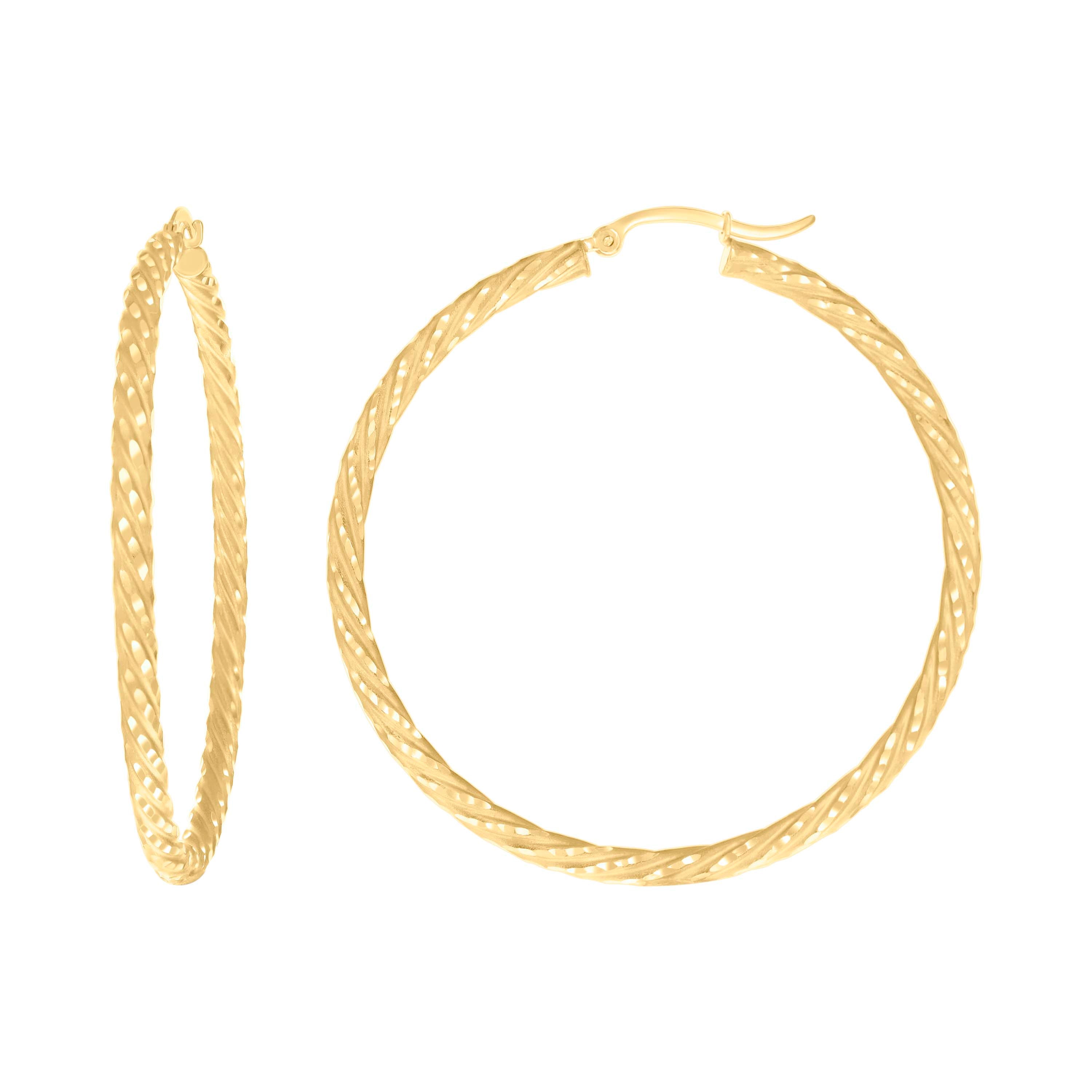 Elevate your style with these exquisite 10Kt Yellow Gold Women's Diamond-Cut Spotted Patterned Fancy Hoop Earrings. Crafted with precision, these hoops showcase a stunning diamond-cut design that sparkles with every movement. The elegant twisted and spotted pattern adds a touch of sophistication, making them perfect for any occasion. Measuring 50mm in height and 3mm in width, these lightweight earrings are comfortable for all-day wear. The hinged back clasp ensures a secure fit, allowing you to wear them with confidence. With a weight of 5.1 grams, these hoops offer both luxury and style without compromising on comfort. Ideal for those who appreciate fine craftsmanship and timeless elegance, these earrings are a must-have addition to your jewelry collection.
