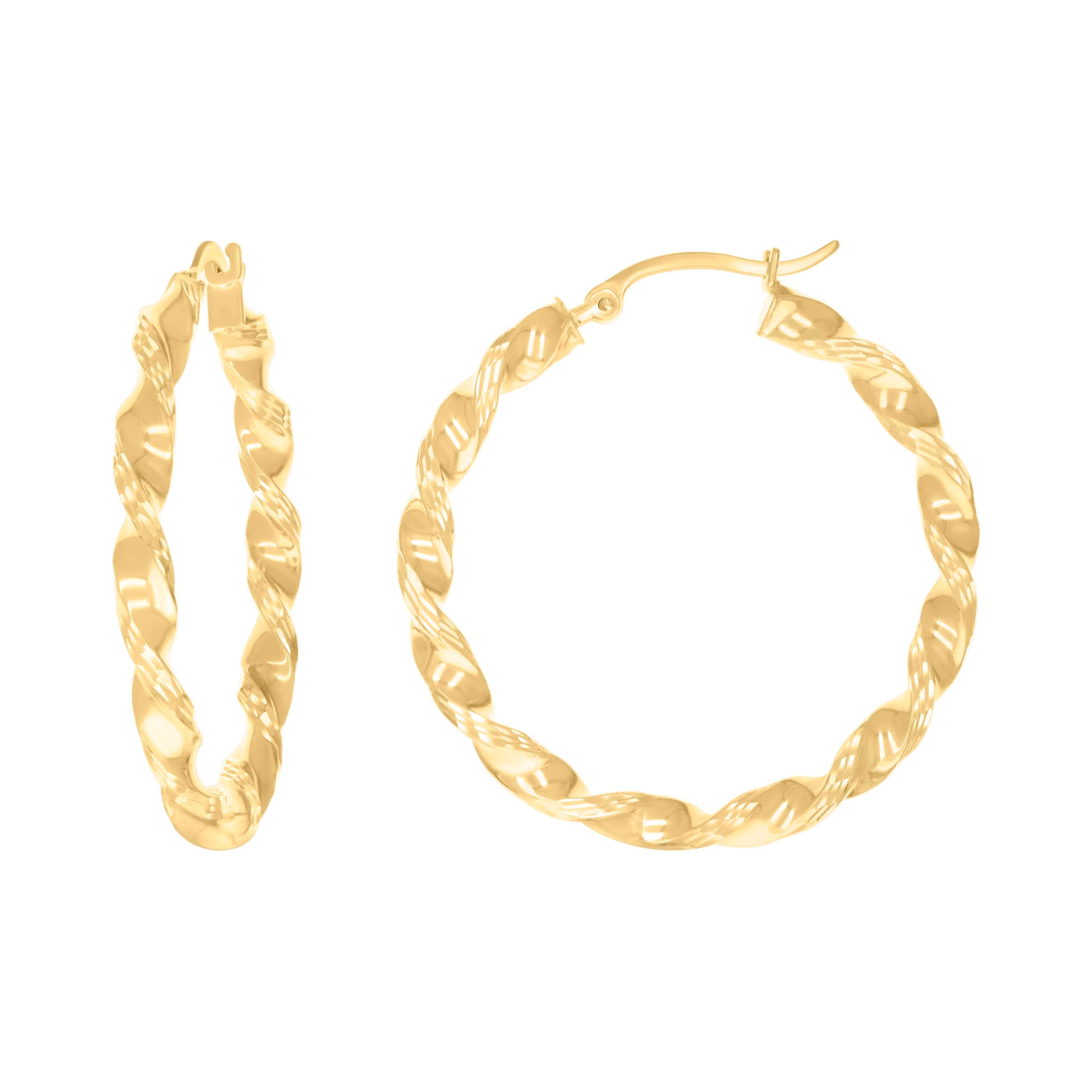 Elevate your style with these exquisite 10kt Yellow Gold Women's Diamond-Cut Twisted Hoop Earrings. Crafted with precision, these hoops feature a stunning twisted design, lending an air of sophistication and elegance to any ensemble. The intricate diamond-cut detailing catches the light beautifully, creating a dazzling effect that is sure to turn heads. With a comfortable 3mm width and a graceful 31mm height, these earrings are the perfect blend of subtlety and statement. The hinged back clasp ensures a secure fit, making them ideal for both everyday wear and special occasions. Experience the timeless allure of these hoops, designed to complement your unique sense of style with their radiant gold finish and artistic craftsmanship.