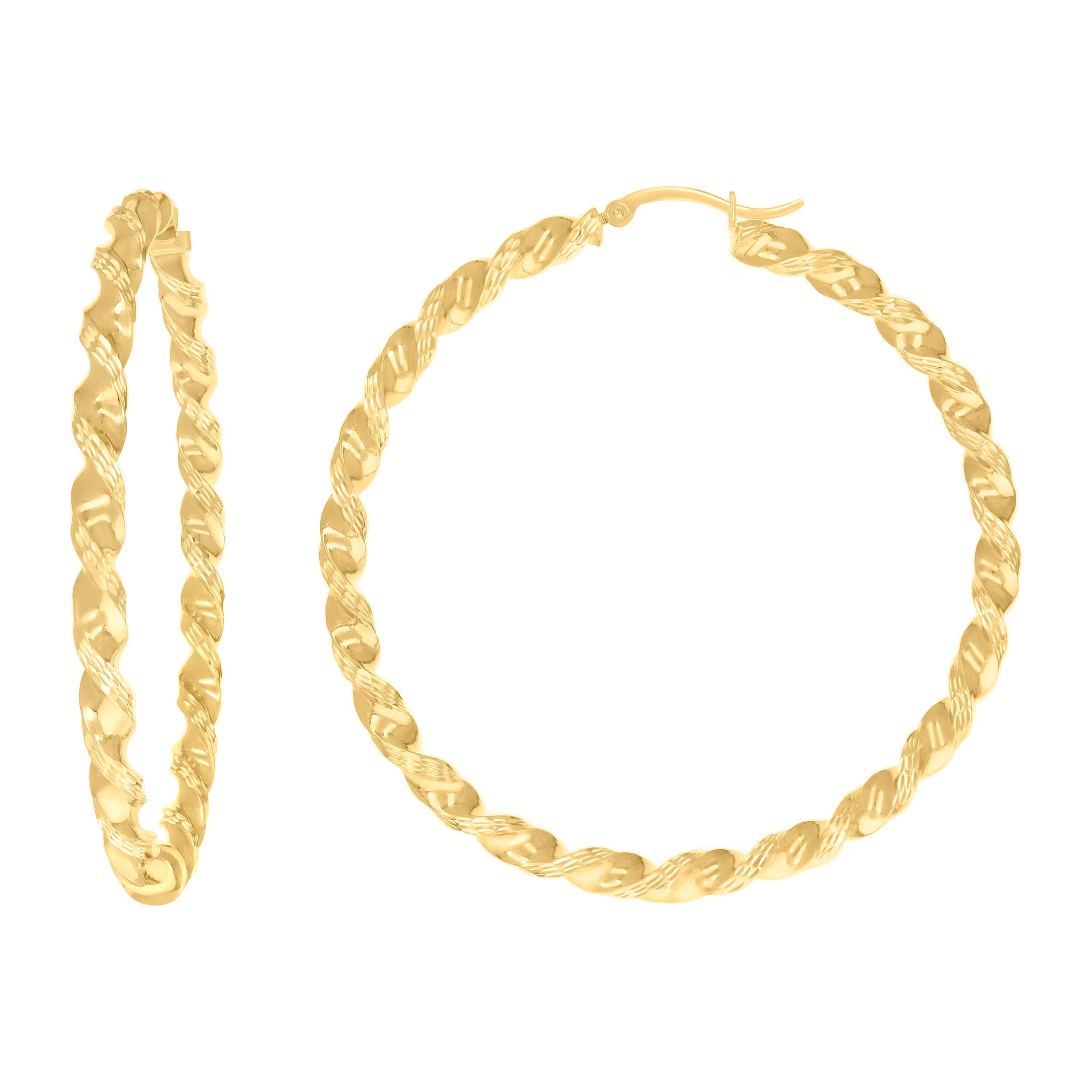 Discover the epitome of elegance and style with our 10kt Yellow Gold Women's Diamond-Cut Twisted Hoop Earrings. These exquisite pieces are meticulously crafted to perfection, featuring a stunning twisted design that captures the light from every angle, creating a dazzling display of brilliance. Each earring measures an impressive 63 mm in height and 4 mm in width, providing a bold yet sophisticated silhouette that complements any outfit. With a weight of 5.2 grams, these earrings offer a comfortable fit while maintaining their luxurious appeal. The hinged back closure ensures secure wear, making them ideal for both everyday elegance and special occasions. Embrace the timeless allure of yellow gold and the intricate artistry of diamond-cut detailing in these captivating hoop earrings, a must-have addition to any jewelry collection.