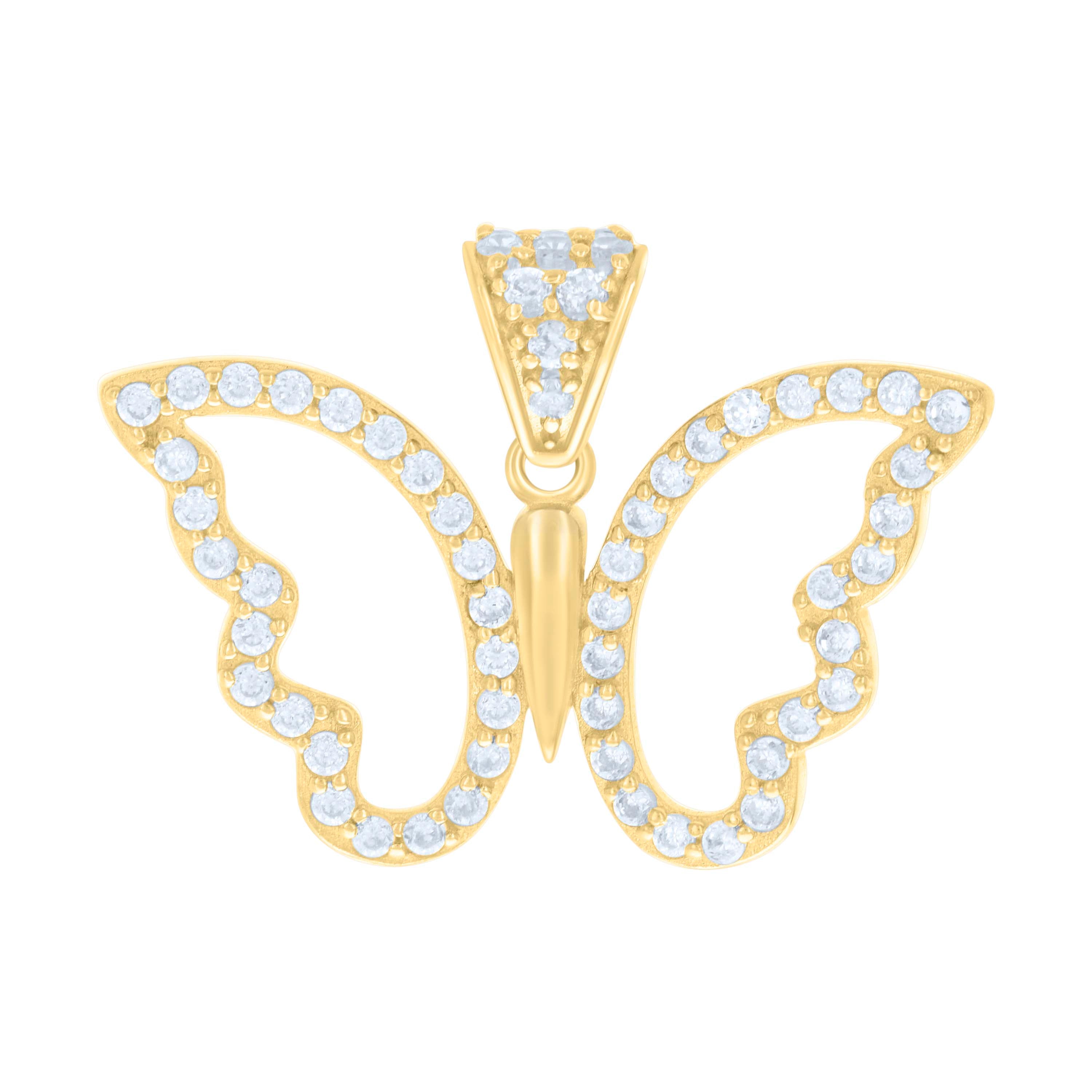 Adorn yourself with the enchanting elegance of our 10Kt Gold Cz Butterfly Pendant. Crafted from pure 10kt real yellow gold, this piece beautifully captures femininity and grace. The polished finish highlights the intricate details of the butterfly design, while the round, prong-set white cubic zirconia stones add a touch of sparkle that catches the light with every movement. Weighing in at a delicate 1.6 grams, this pendant is both lightweight and luxurious, perfect for daily wear or special occasions. Measuring 18.8MM in height and 24.8MM in width, it sits gracefully on the neckline, making it a standout addition to any jewelry collection. Completed with a single bail closure, it’s easy to pair with your favorite chain. Elevate your style and make a statement wherever you go with this timeless piece. Ideal for the modern woman who appreciates elegance and sophistication.