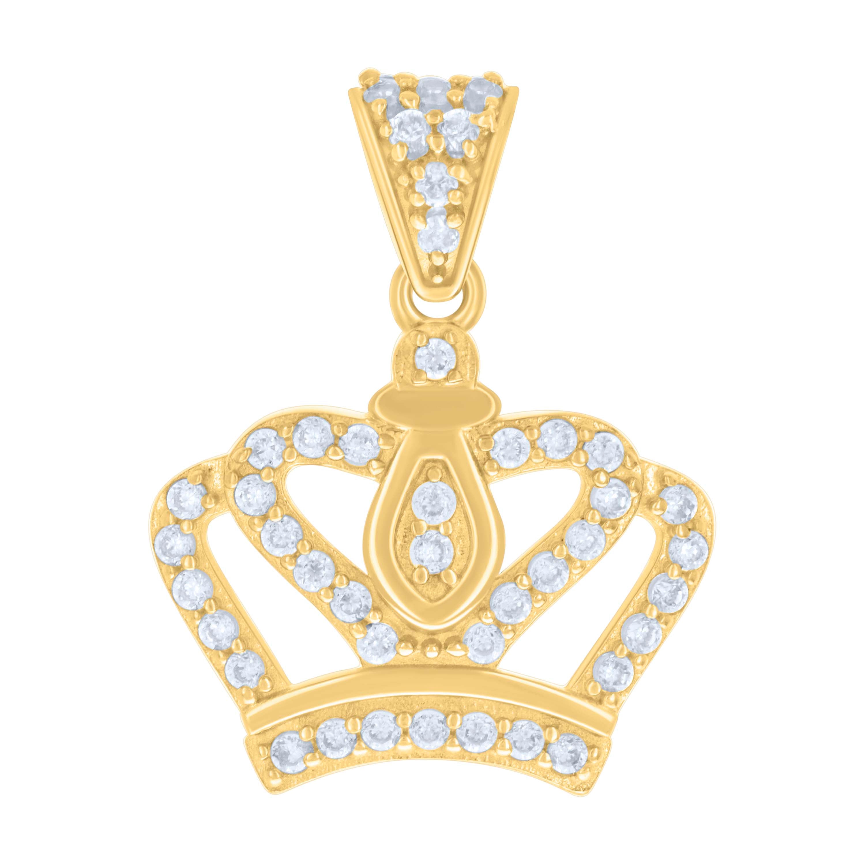 Elevate your elegance with our exquisite 10Kt Gold CZ Pendant. Crafted from genuine 10kt yellow gold, this women's pendant features a dazzling crown design adorned with pristine white round cubic zirconia, set expertly in secure prongs. Its polished finish enhances the luxurious appeal, while the single bail closure ensures ease of wear. Weighing just 1.4 grams, this refined piece measures 22.4MM in height and 16.6MM in width, making it a perfect blend of grace and sophistication. Ideal for any occasion, this pendant adds a touch of glamour to your ensemble. Embrace the allure of timeless beauty with this stunning fashion charm.