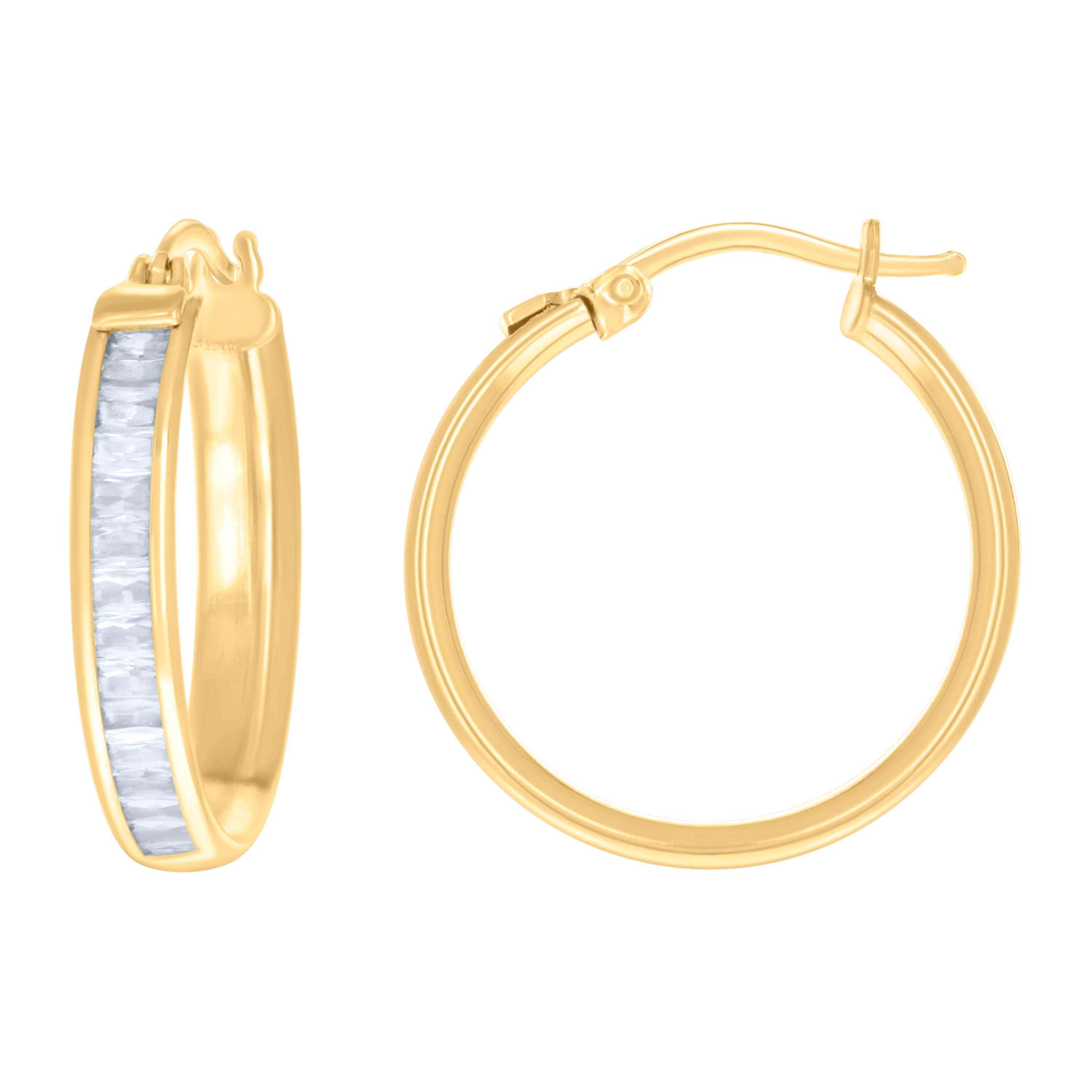 Dazzle in elegance with these exquisite 10Kt Real Yellow Gold Women's Baguette Cubic-Zirconia Fashion Hoops Huggies Earrings. Crafted from pure 10k gold, these stunning earrings boast a polished finish for a radiant shine. Weighing just 2.5 grams, they offer lightweight comfort with a secure hinged back closure. Measuring 21.6MM in height and 3.4MM in width, these hoops feature a chic channel setting that showcases brilliant white baguette cubic-zirconia stones, adding a touch of luxury to any ensemble. Perfect for elevating your everyday style or complementing a special occasion, these earrings are a must-have accessory for the modern woman.