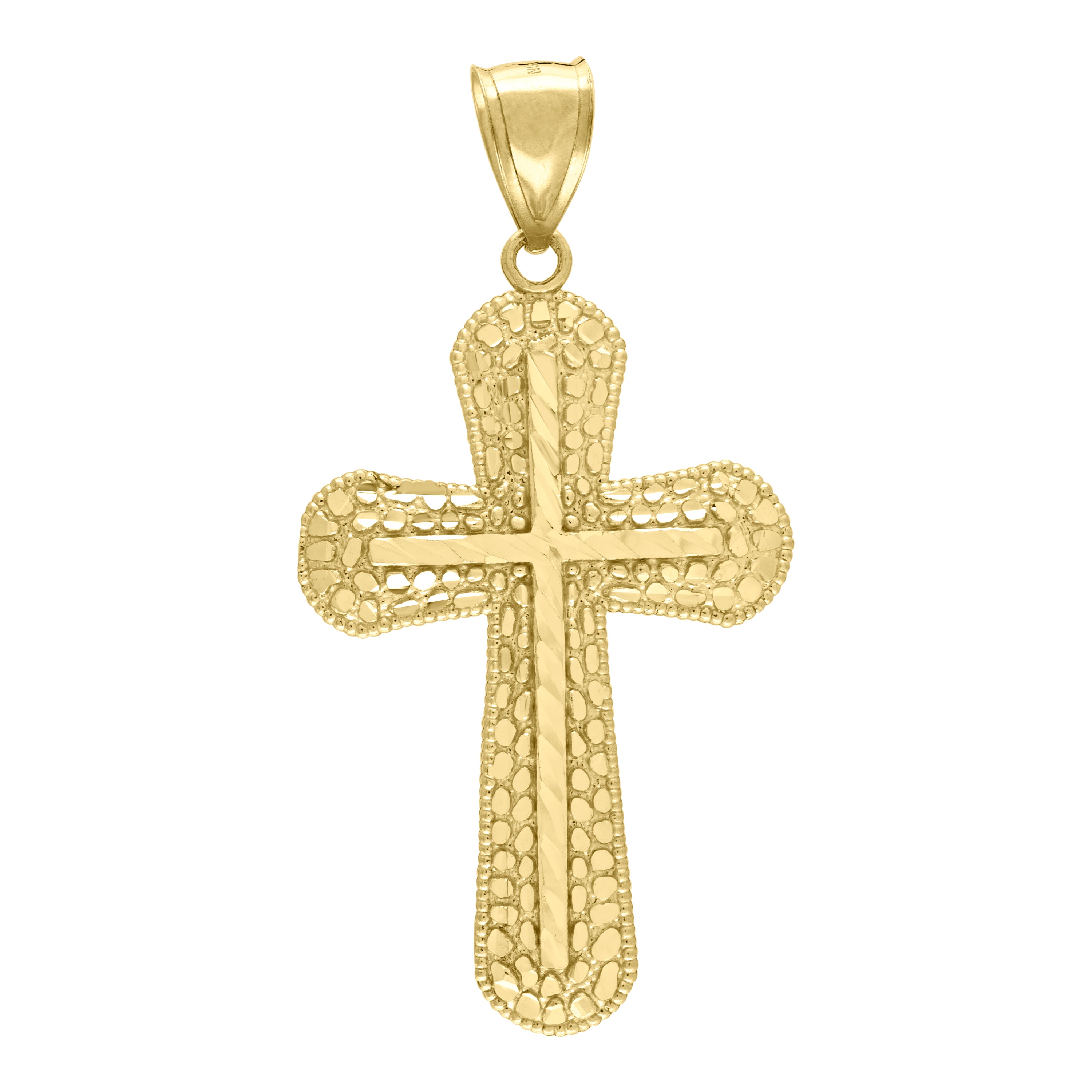 Elevate your style and express your faith with this exquisite 10Kt Gold Pendant, meticulously crafted for the discerning gentleman. Made from pure 10kt real yellow gold, this men's nugget cross religious charm pendant boasts a substantial weight of 4.9 grams, ensuring a premium feel and lasting durability. The pendant features a stunning diamond-cut finish, enhancing its brilliance and adding a touch of sophistication. Measuring 59.2MM in height and 29.1MM in width, it makes a bold yet elegant statement. Designed with a single bail closure, it is easy to pair with your favorite chain. This pendant is a timeless symbol of spirituality and style, perfect for any occasion. Make it yours and wear your faith with pride.