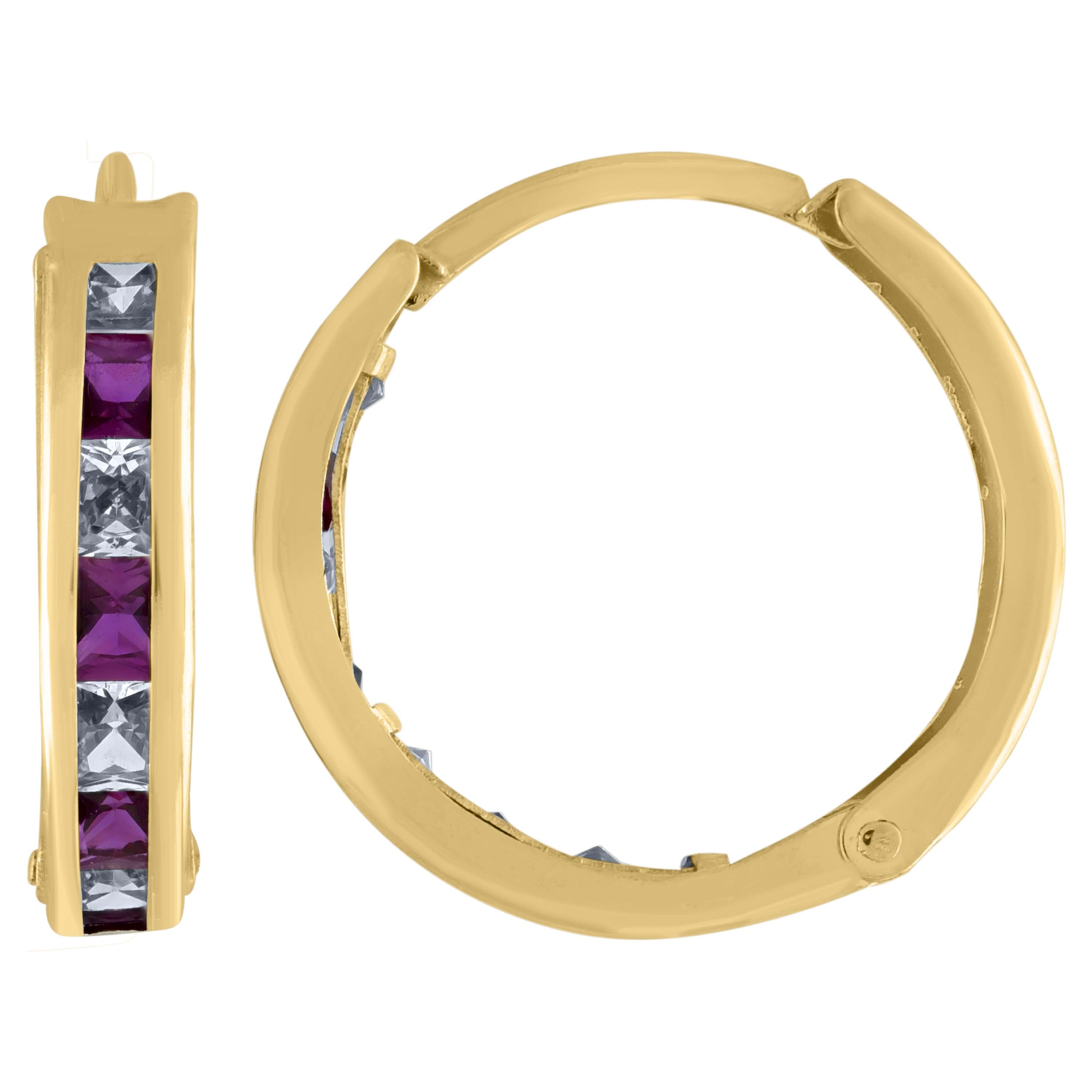 Add a touch of elegance to your ensemble with these 10Kt Gold Hoop Earrings. Crafted from pure 10kt real yellow gold, these polished earrings exude sophistication and charm. The huggie hoop design showcases princess-cut white and purple cubic zirconia stones, set in a channel style that sparkles with every movement. With a graceful height of 14.5MM and a width of 12.3MM, they are lightweight at just 1.2 grams, ensuring comfort throughout the day. The endless closure adds security while enhancing the sleek finish. Perfect for women who appreciate timeless beauty, these earrings are a must-have accessory for any jewelry collection.